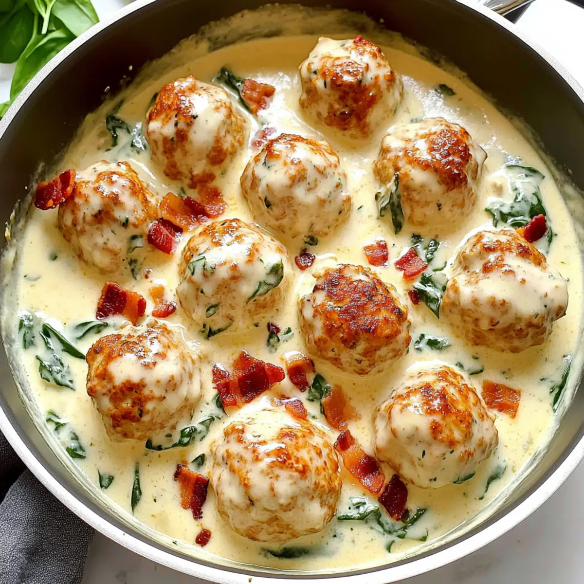Once everything is warm and well-combined, serve your Baked Chicken Ricotta Meatballs with Spinach Alfredo Sauce immediately. Garnish with the crispy bacon and chopped parsley for a pop of color and extra flavor, making the dish visually appealing and delicious.