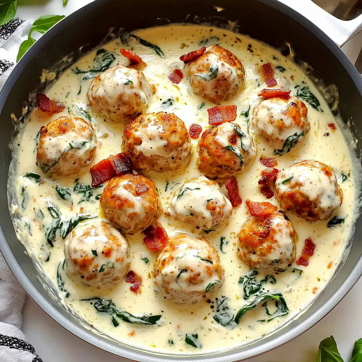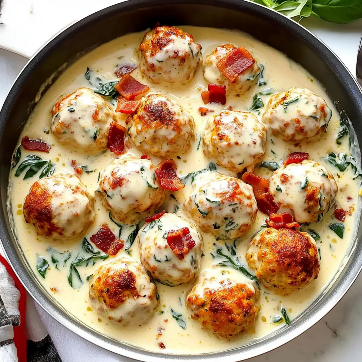 Add the baby spinach to the Alfredo sauce, cooking until just wilted—this should take about 2 minutes. Carefully incorporate your baked meatballs into the sauce, allowing them to soak up the creamy goodness as the sauce thickens slightly.