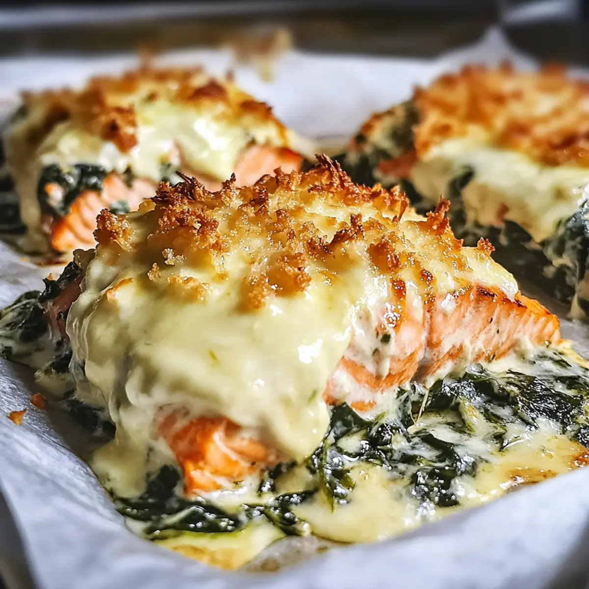 - In a greased baking dish, place the seared salmon fillets skin-side down. Spoon the creamy spinach mixture over each fillet and sprinkle with mozzarella cheese.