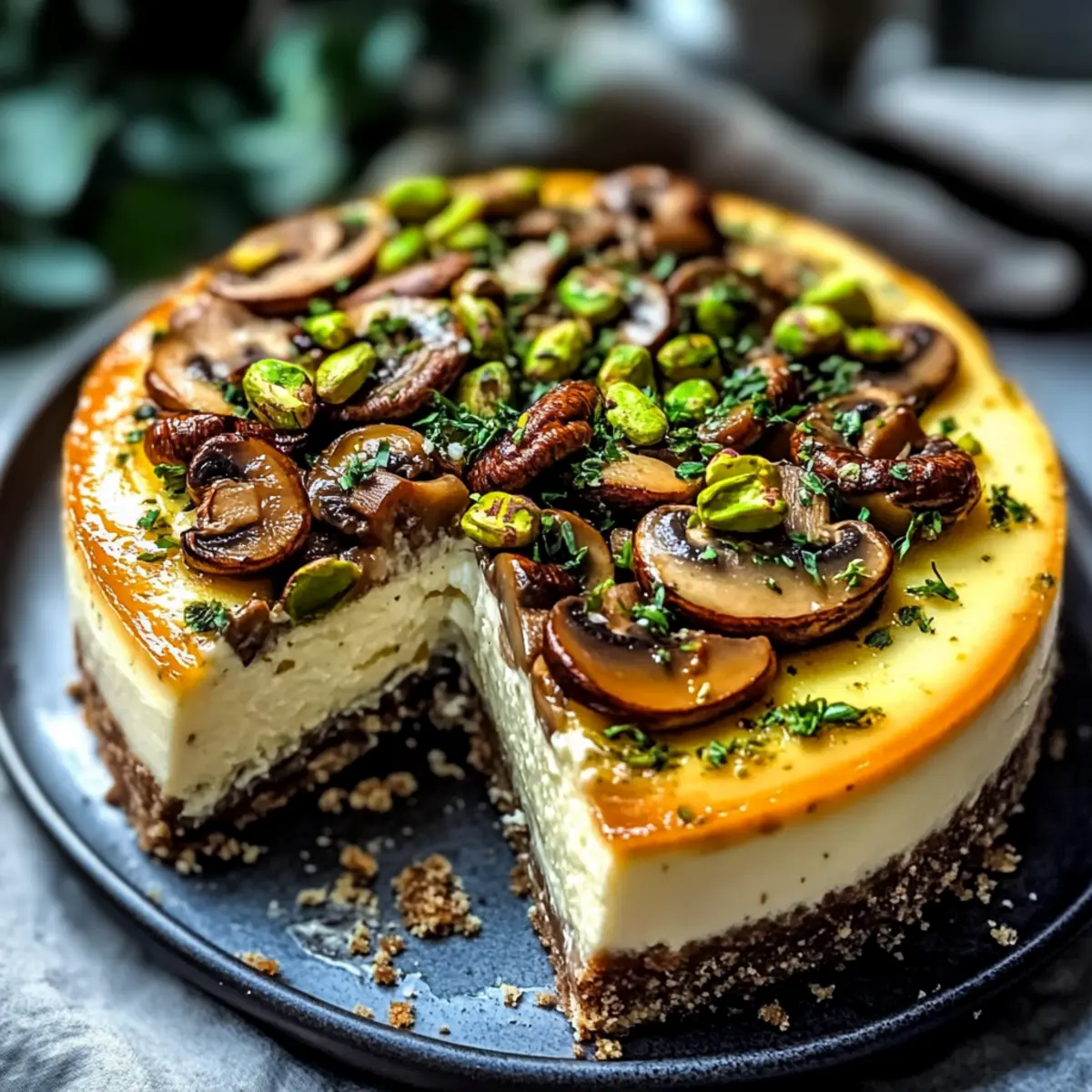 Savory Pistachio and Mushroom Cheesecake with Feta Crust