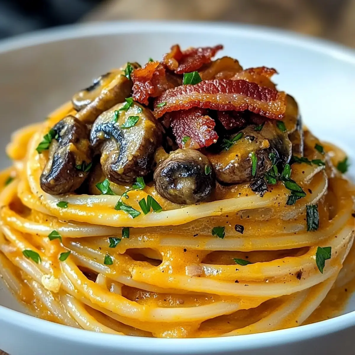 Creamy Pumpkin & Mushroom Spaghetti with Crispy Bacon Bliss