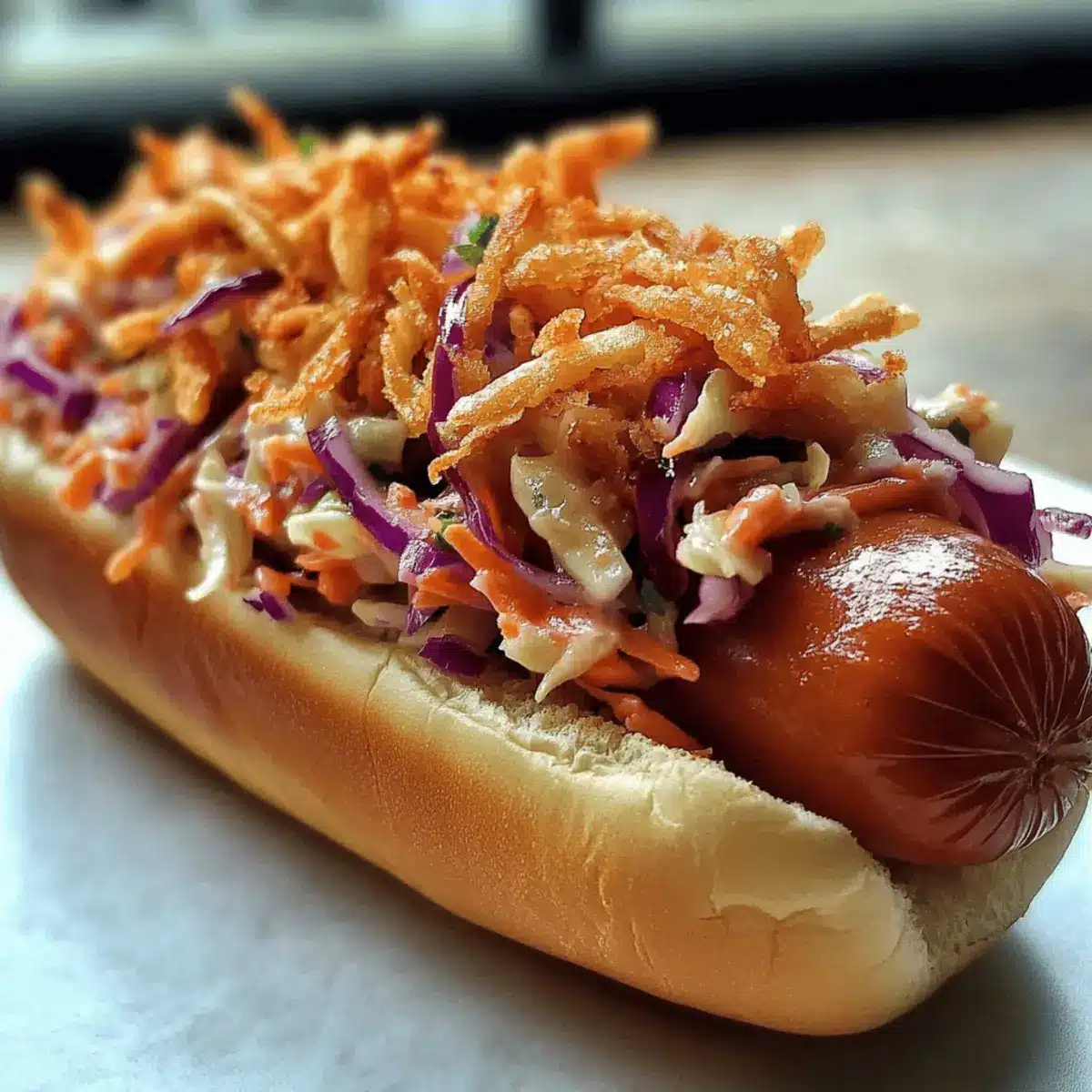 Firecracker Hot Dogs with Spicy Slaw and Crispy Onions Bliss