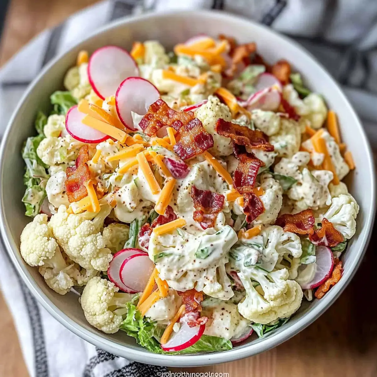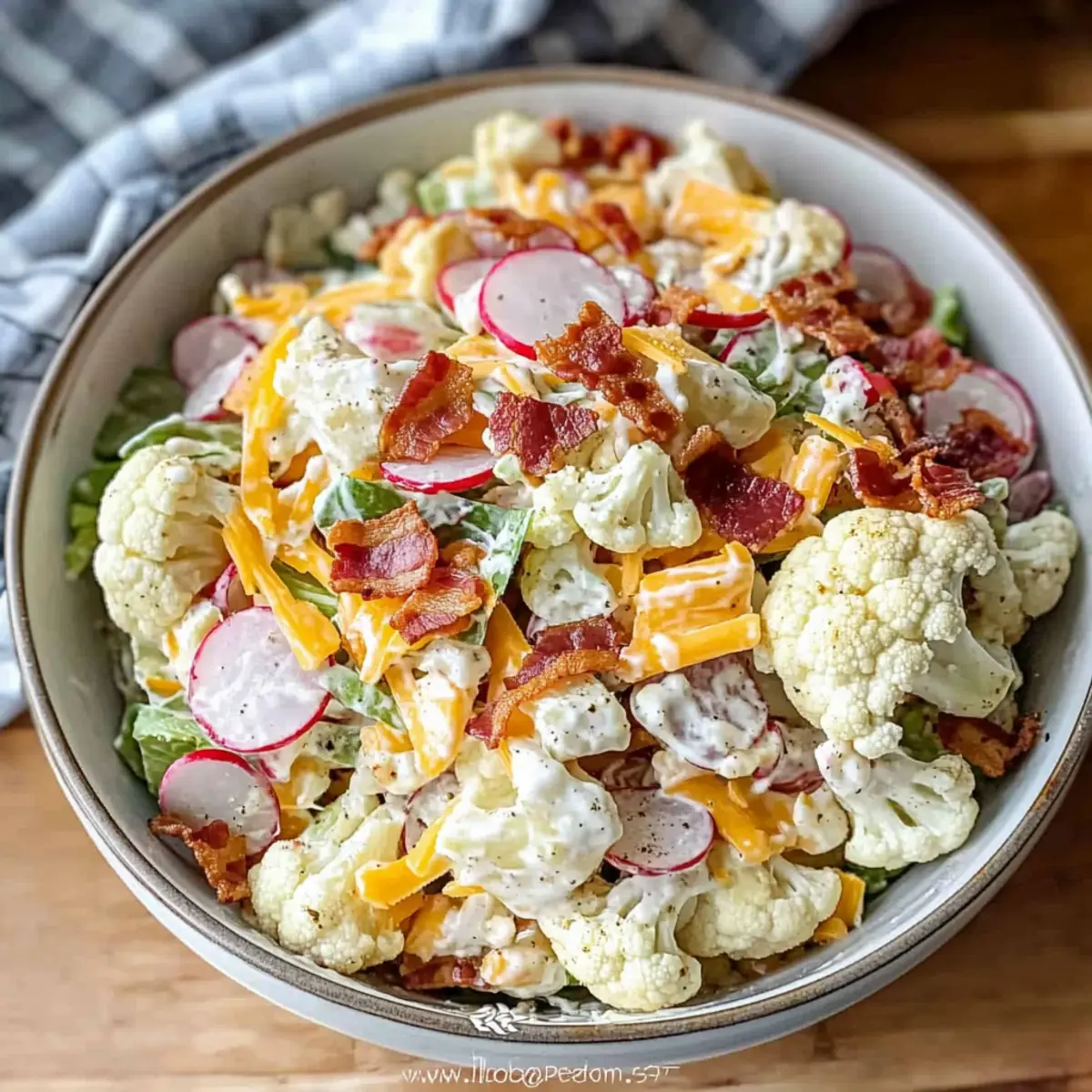 - Combine cooled roasted cauliflower with radishes, celery, cheddar cheese, green onions, and bacon.