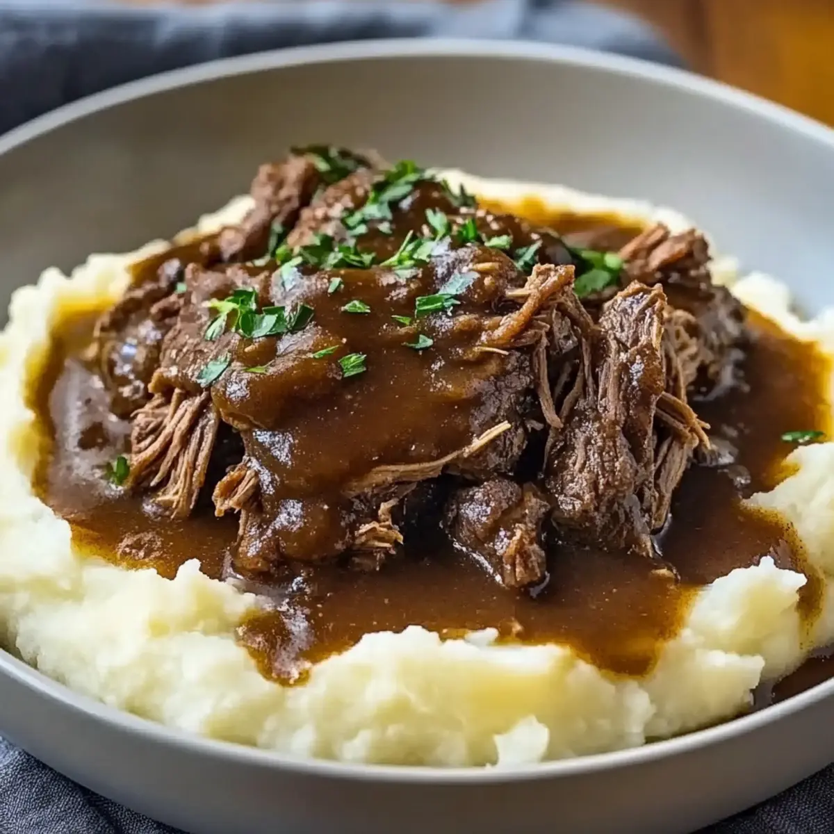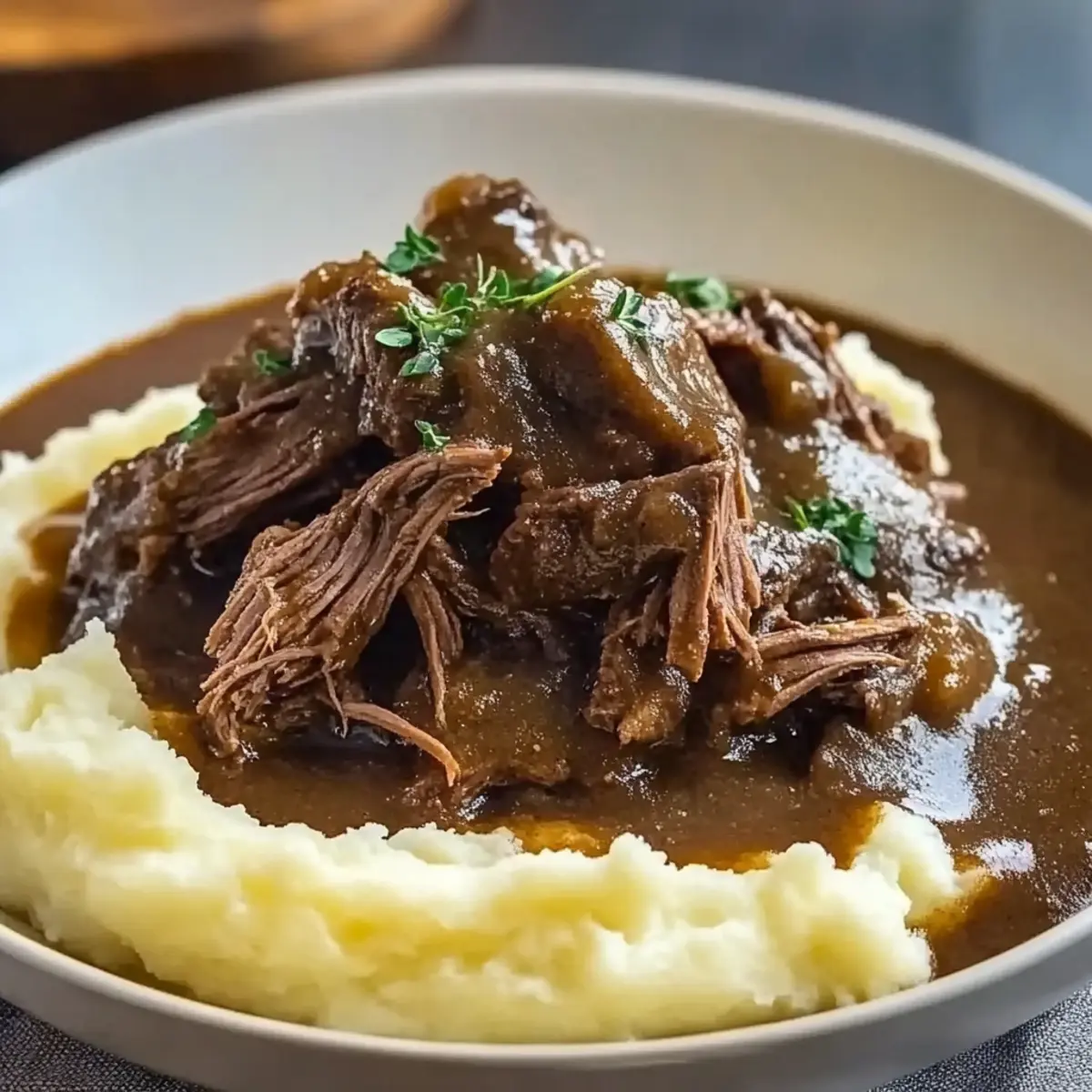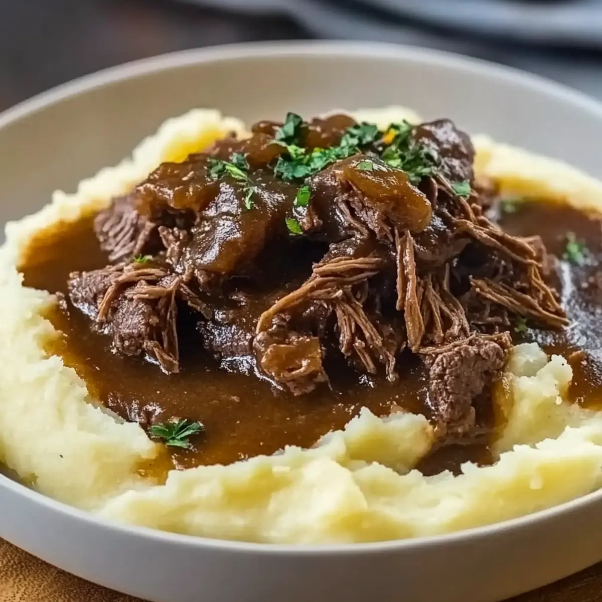 - Step 8: Serve & Enjoy - Plate the mashed potatoes topped with shredded beef and gravy.
