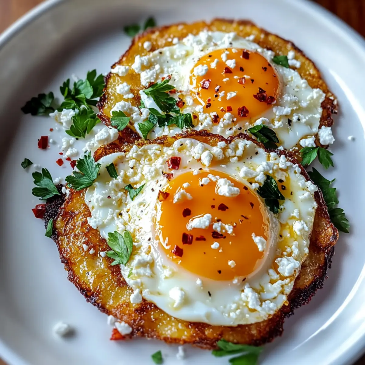 If desired, scatter freshly chopped parsley and red pepper flakes over the eggs for an added touch of flavor and color. This optional step adds a burst of freshness and a slight kick, enhancing the overall Mediterranean vibe of the Crispy Feta Fried Eggs.