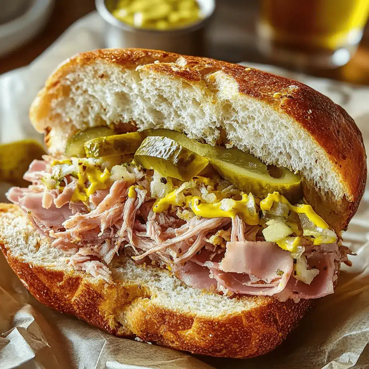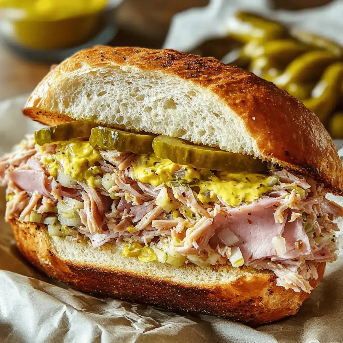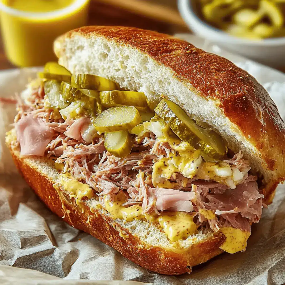 Comfort Food Redefined: Combining savory pulled pork with crunchy pickles and creamy mustard, every bite offers a satisfying balance of flavors.