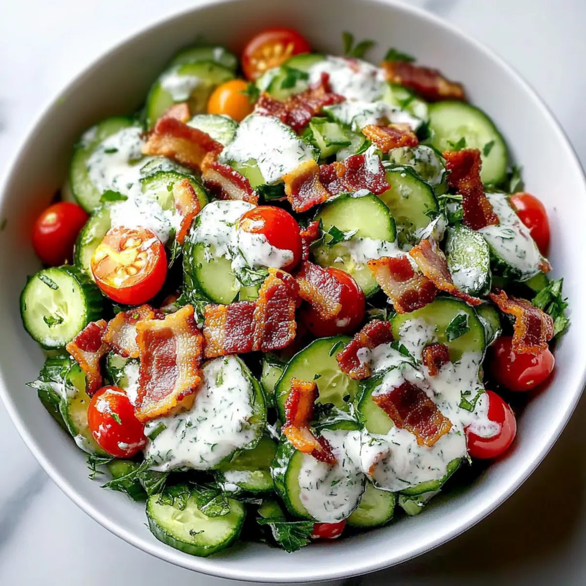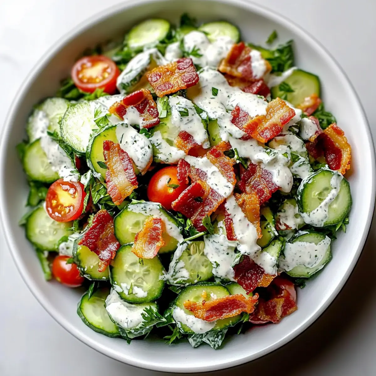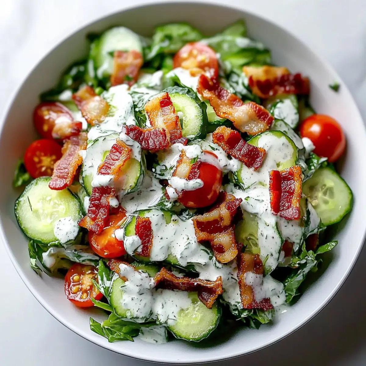 Drizzle a generous amount of ranch dressing over the vegetable mixture. Carefully toss the salad until all the ingredients are well-coated in the creamy dressing. Allow the flavors to meld as you mix, ensuring each cucumber and crispy bacon piece is enveloped in ranch goodness—this step is essential for a flavorful Cucumber Bacon Ranch Salad.