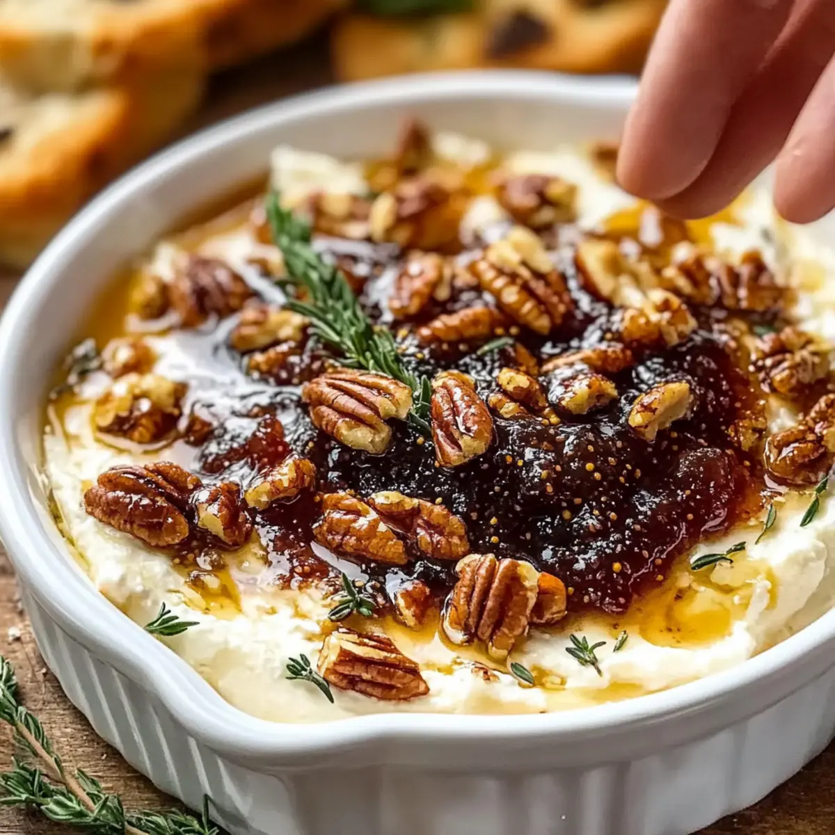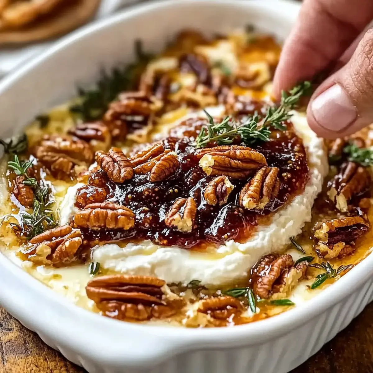 - Sprinkle the toasted pecans, thyme, and rosemary over the baked spread.
