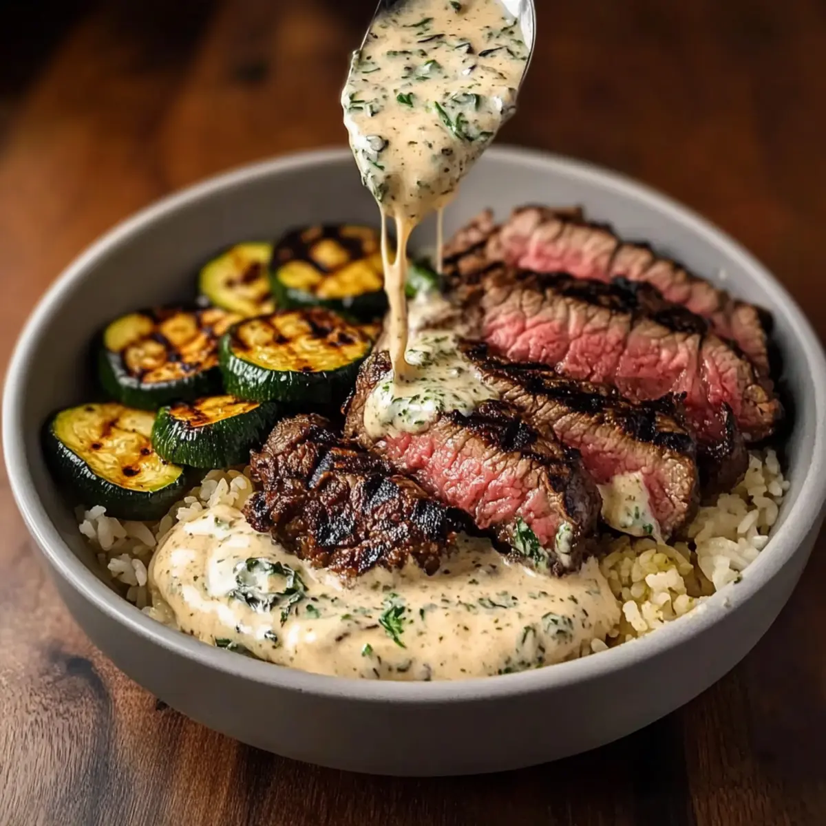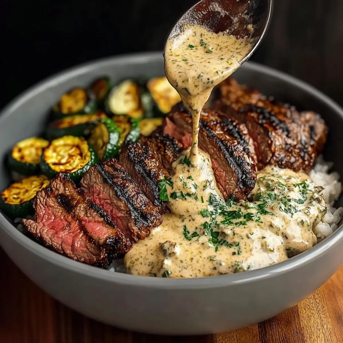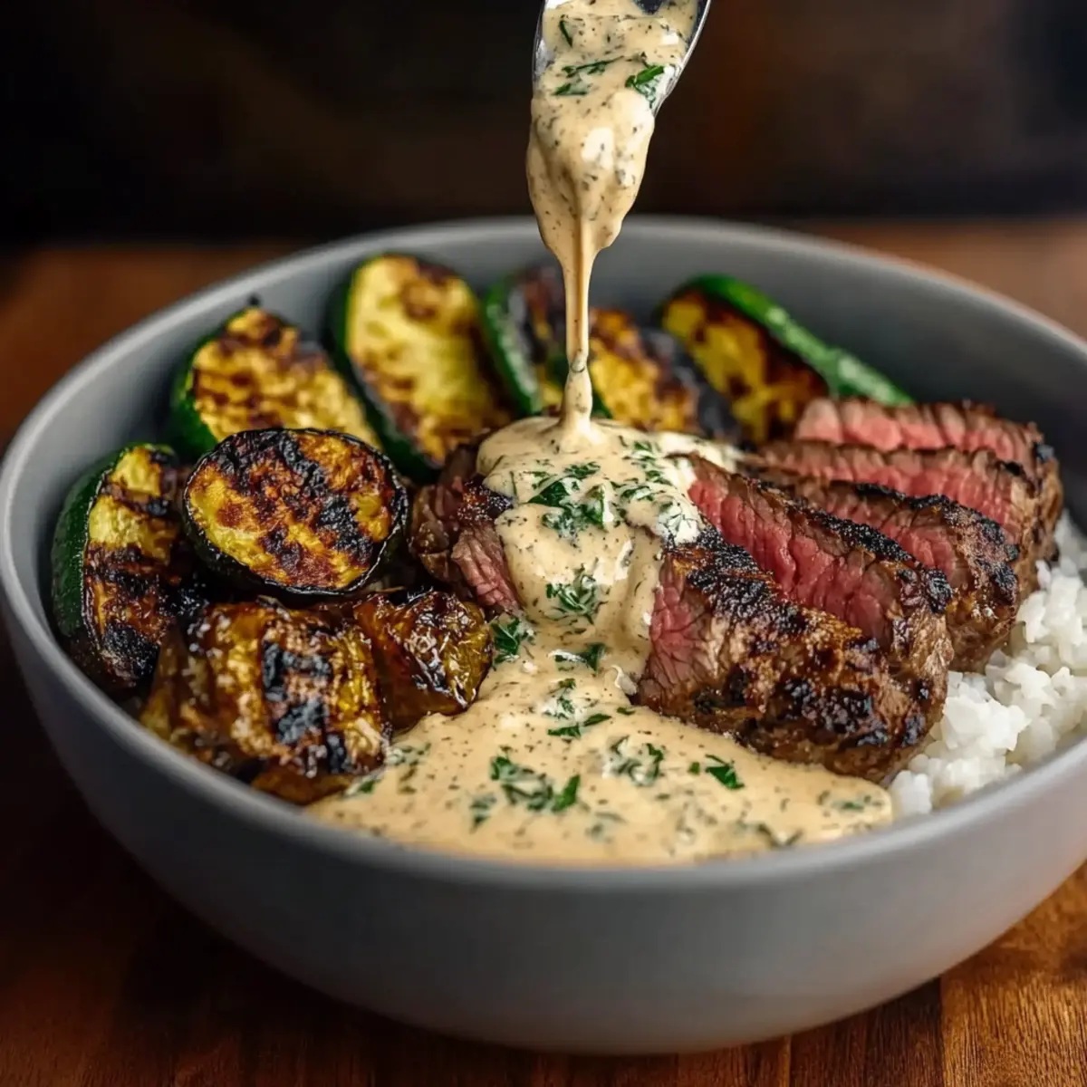 - Assemble the Bowl: Spoon warm rice or mashed potatoes, layer grilled zucchini, add sliced steak, and drizzle with creamy herb sauce.