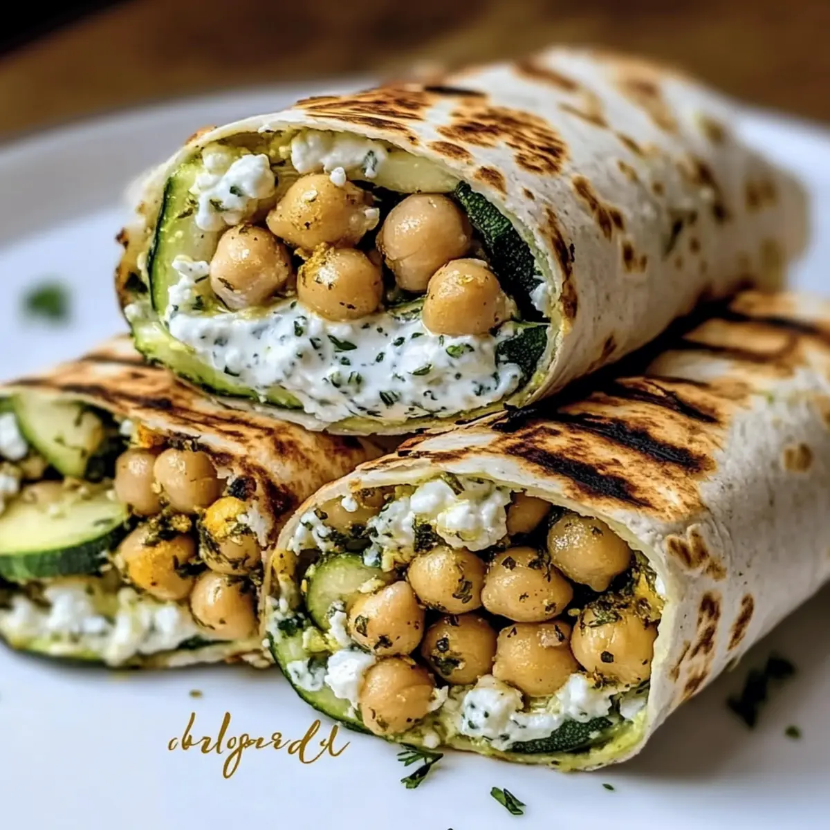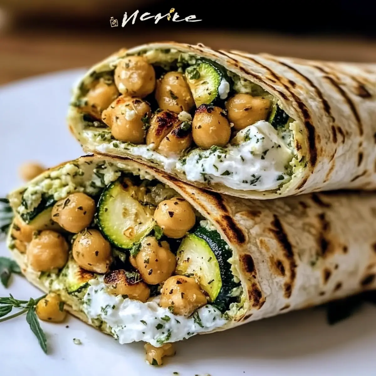 - Lay a tortilla flat, add grilled zucchini, chickpeas, crumbled feta, and drizzle with herbed yogurt sauce. Roll tightly.