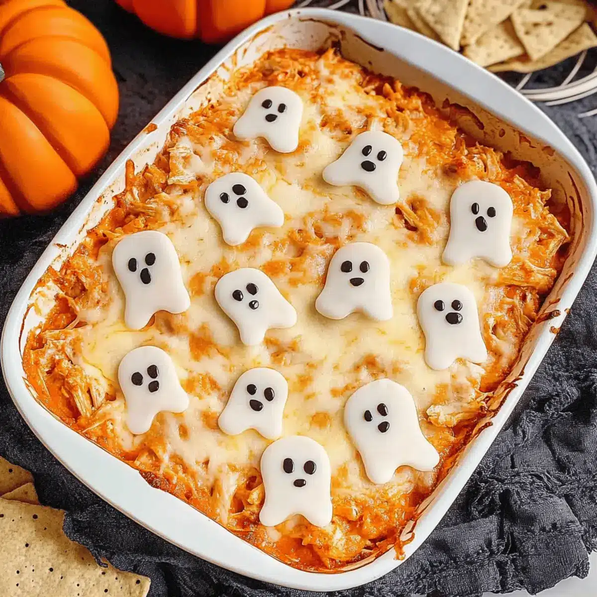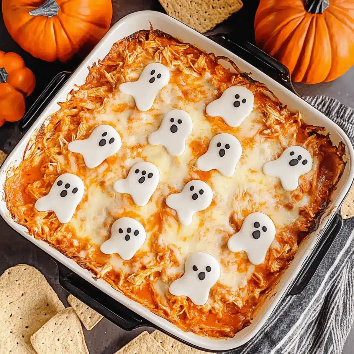 Spooktacular fun: This Halloween Buffalo Chicken Dip transforms an ordinary gathering into a festive celebration with playful cheese ghosts sure to delight both kids and adults.