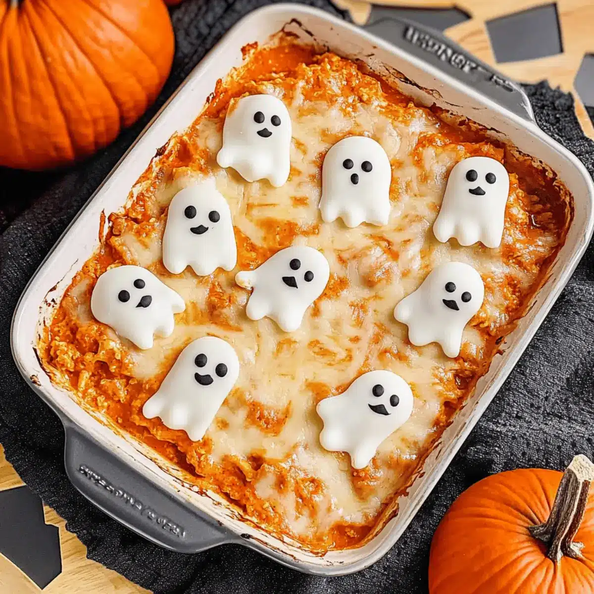 - Cut ghost shapes from the mozzarella slices and arrange on top of the chicken layer.