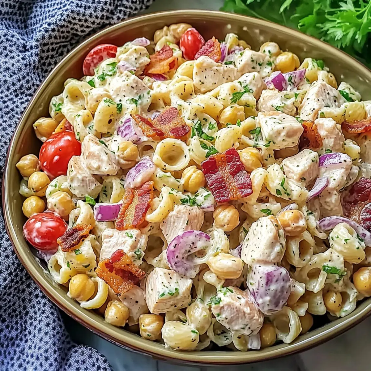 - Chop the roasted chicken and bacon into bite-sized pieces. In a large mixing bowl, combine chickpea pasta, chicken, bacon, tomatoes, red onion, and scallions. Pour the dressing over and mix well.