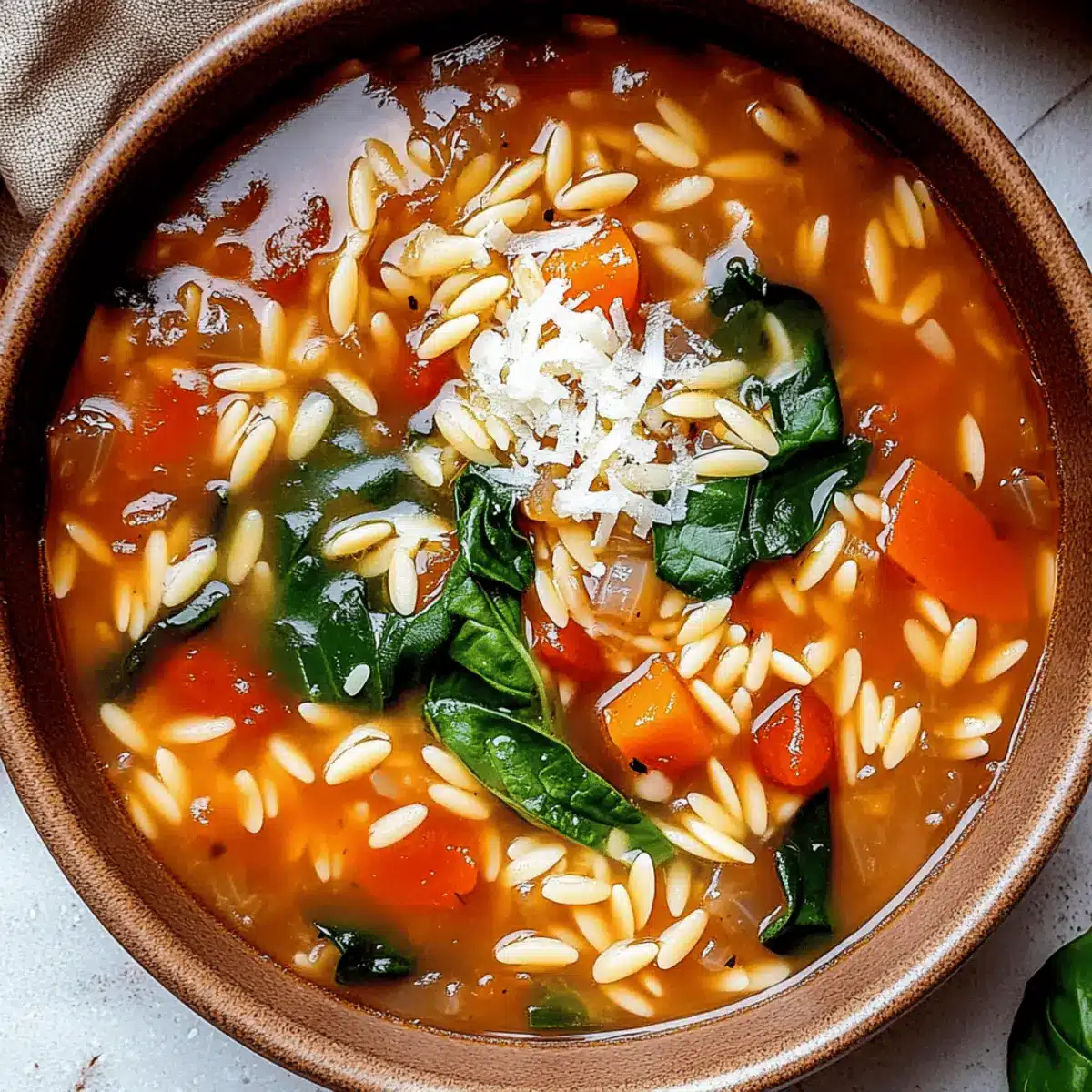 - Serve the Italian Orzo Spinach Soup hot, garnished with freshly grated Parmesan cheese and a sprinkle of chopped fresh basil if desired.