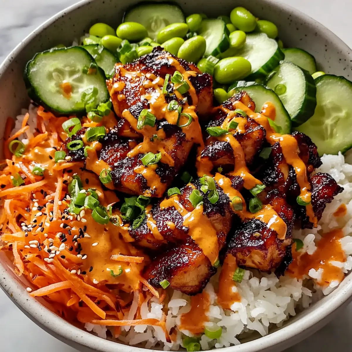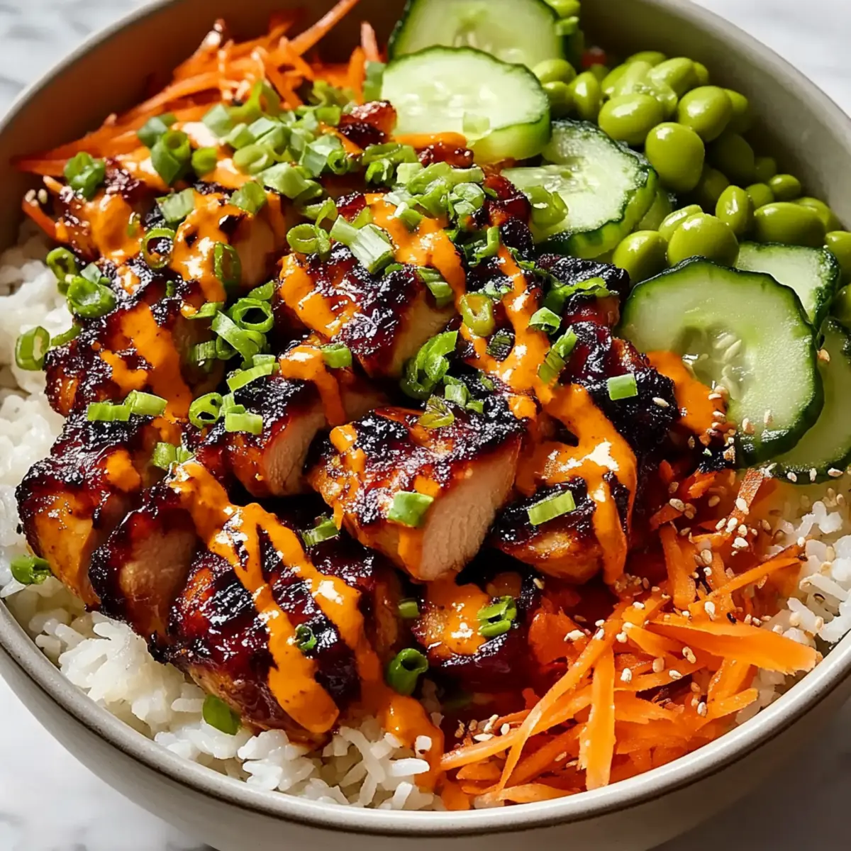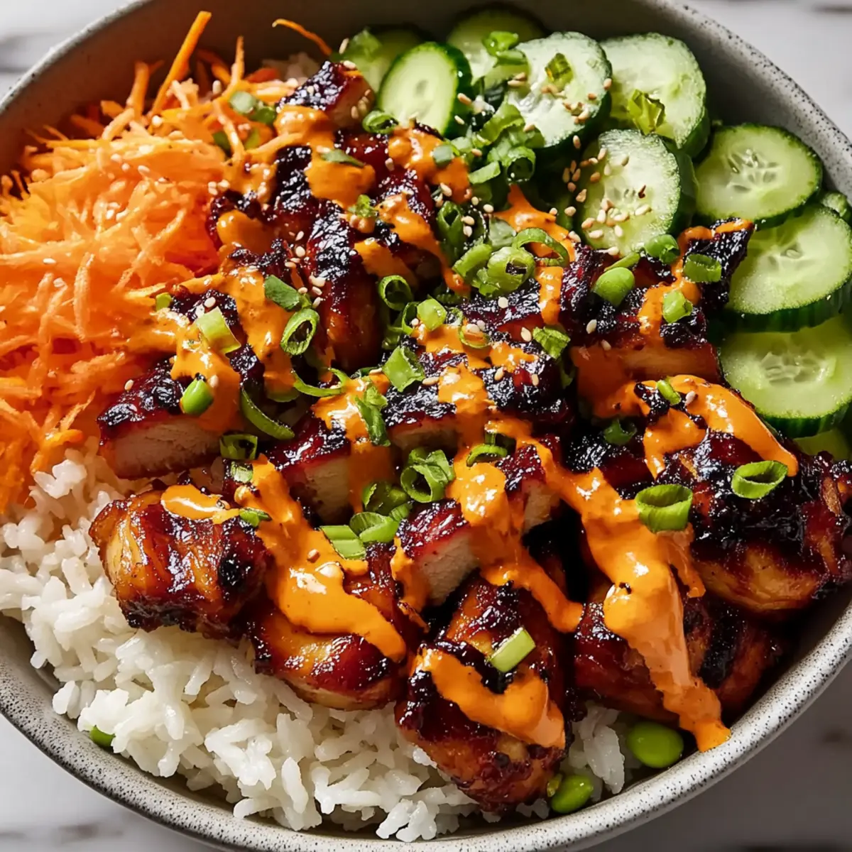 Layering Fresh Veggies: Adding toppings like cucumbers and shredded carrots not only enhances the flavor but also gives vibrant color and crunch to the Korean BBQ Chicken Bowls.
