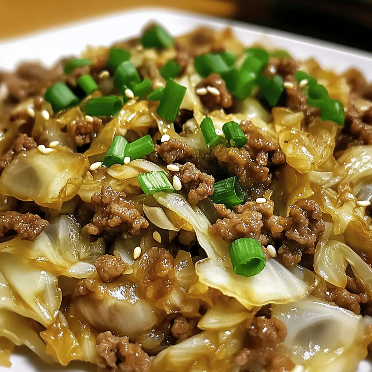 Finally, remove the skillet from heat and serve the dish immediately. Top with sliced green onions and toasted sesame seeds for added flavor and visual appeal. This simple yet delicious Low-Carb Mongolian Ground Beef and Cabbage is ready to be enjoyed, bringing warmth and satisfaction to your table!