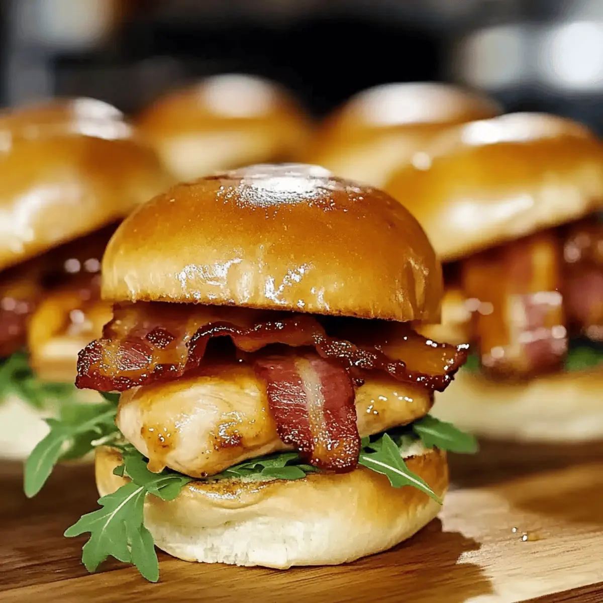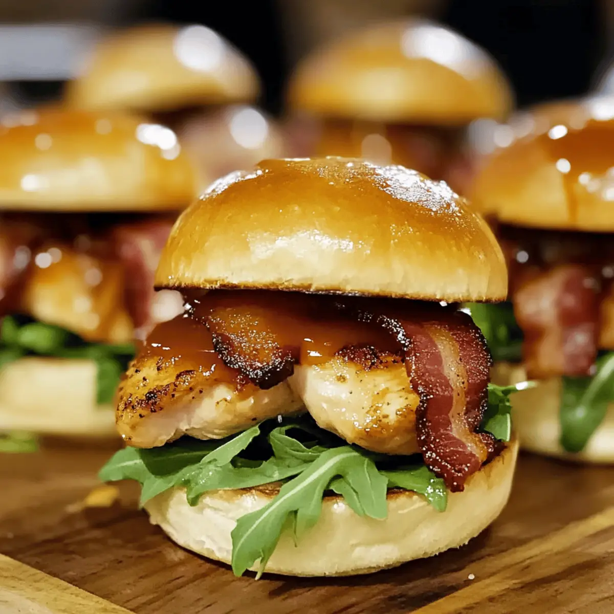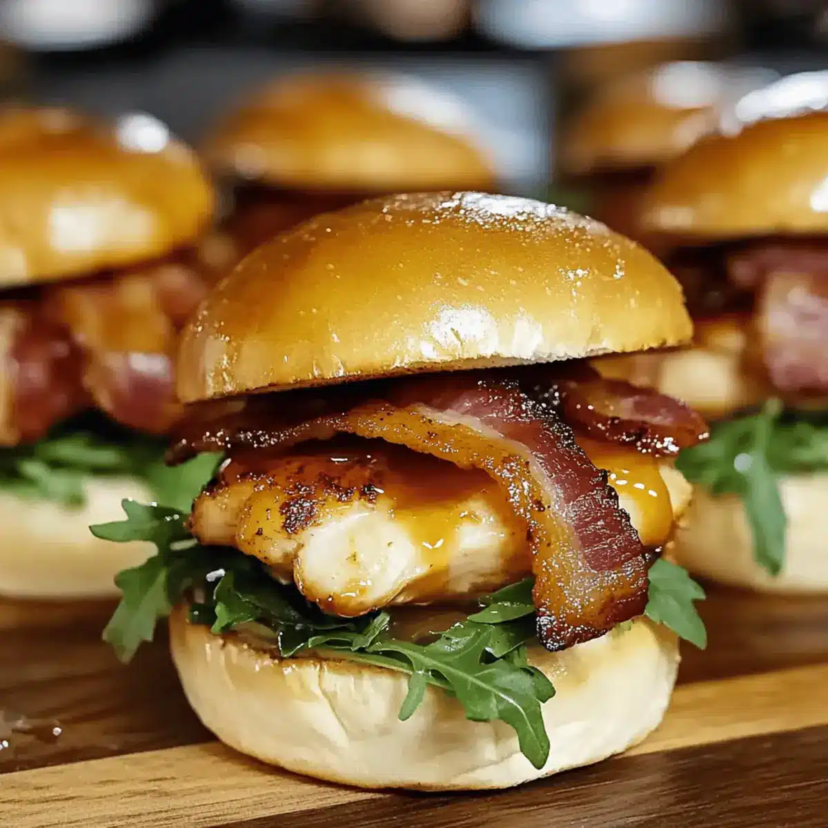 - Assemble sliders with arugula, chicken, and bacon between the toasted bun halves.