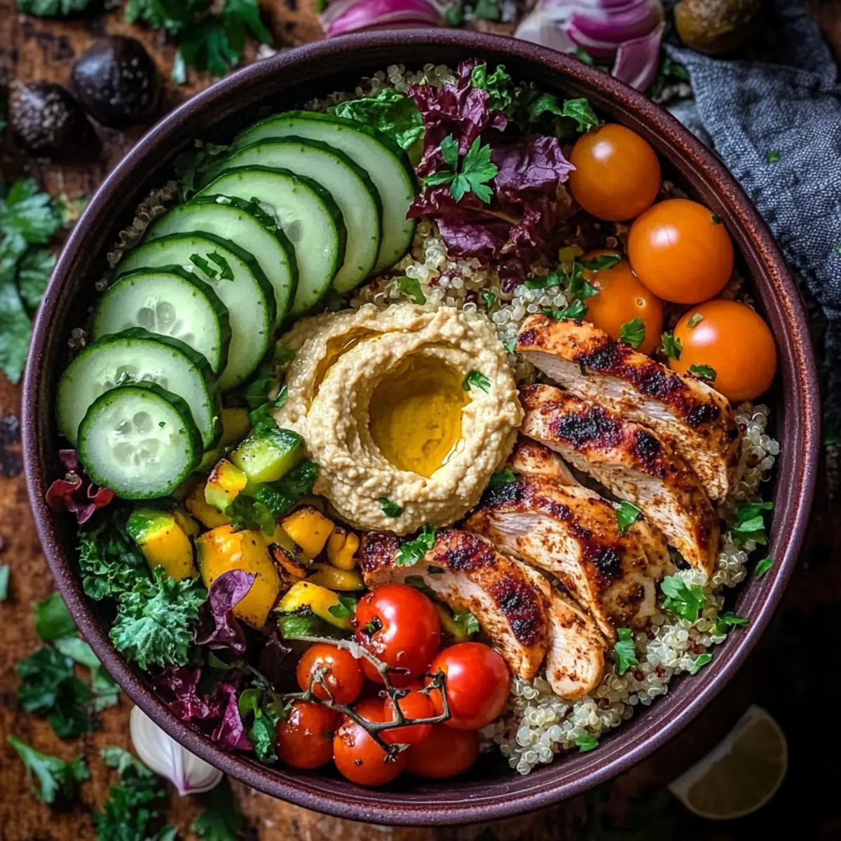These Mediterranean Chicken Bowls are perfect for busy meal prep fans! You can cook the chicken and quinoa up to 3 days in advance. Store the grilled chicken in an airtight container in the refrigerator to keep it juicy, and refrigerate the quinoa in a separate container to maintain its texture. Fresh veggies can also be chopped ahead, ideally a few hours before serving to ensure they remain crisp. When you’re ready to enjoy, simply reheat the chicken and quinoa in a microwave or on the stove until warmed through, assemble your bowls, add the hummus and dressing, and savor a delicious meal that’s just as vibrant and hearty as if it were freshly made!