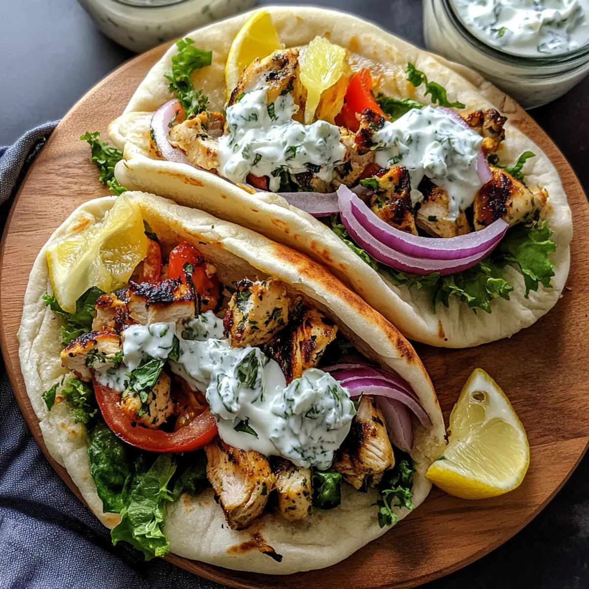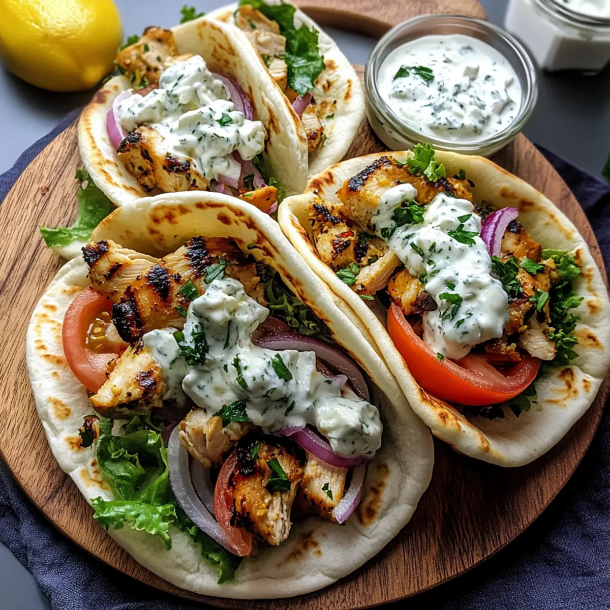 - Assemble by layering sliced grilled chicken, tzatziki, and fresh toppings in warm pita, and roll tightly.