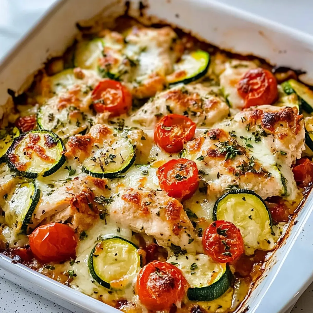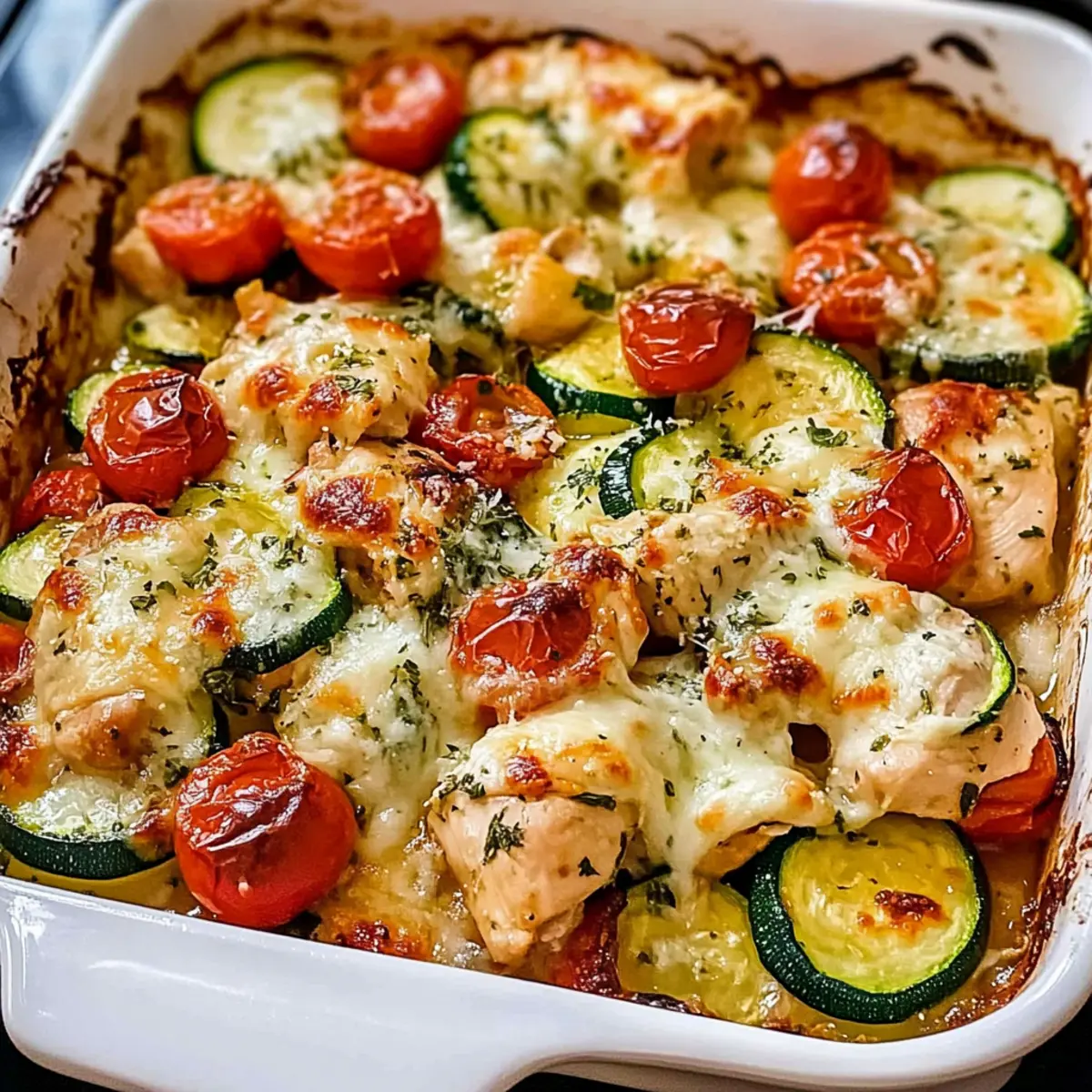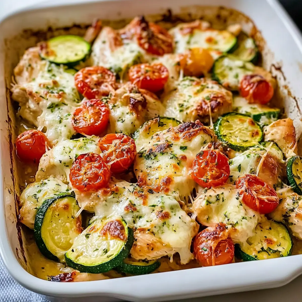 Once baked to perfection, remove your Mediterranean Chicken Zucchini Bake from the oven and let it sit for a few minutes. Garnish it with freshly chopped parsley to add a pop of color and freshness. Serve warm and enjoy this delightful dish that pairs beautifully with rice, quinoa, or crusty bread!