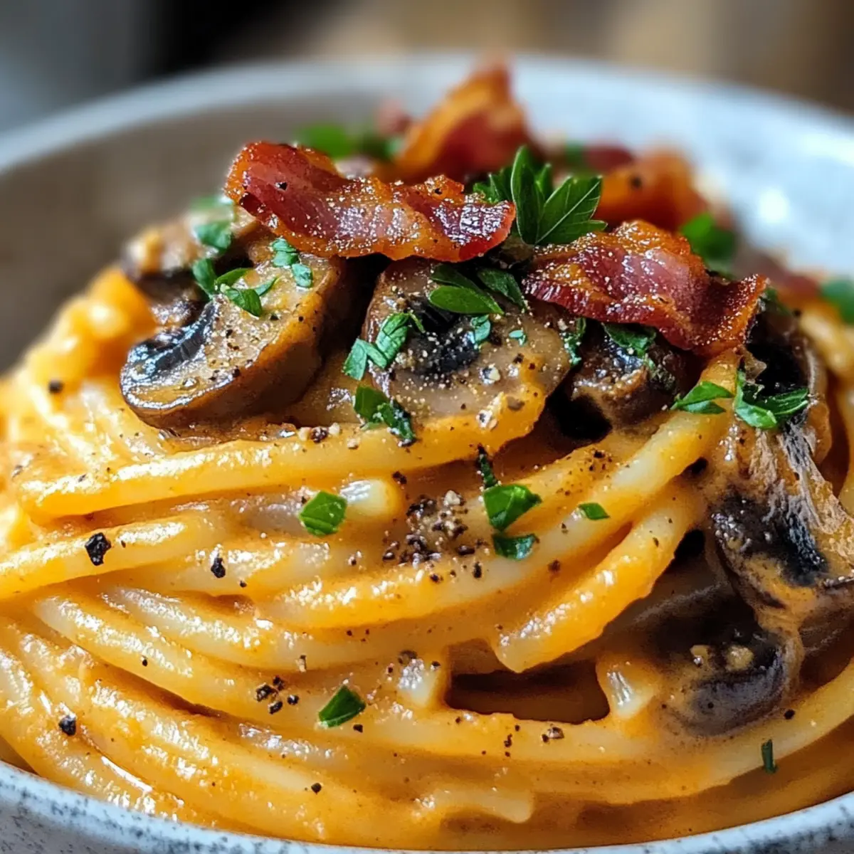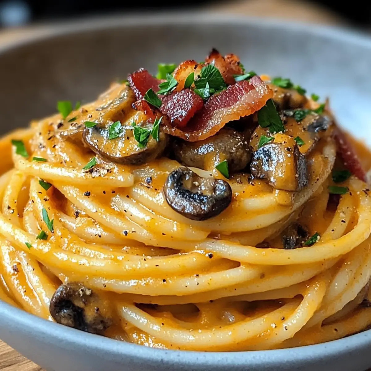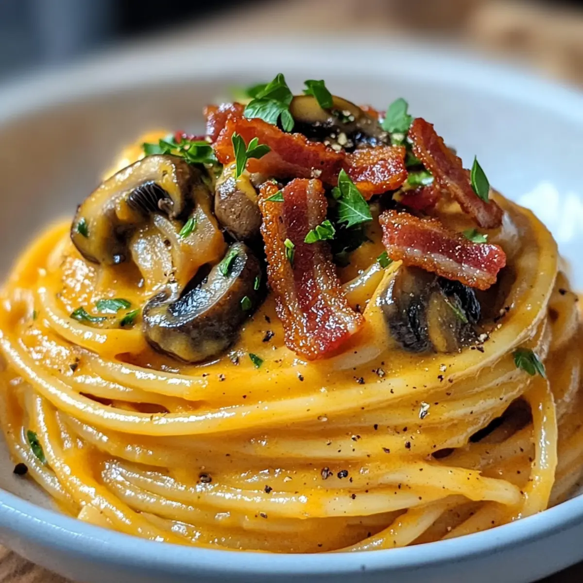 Creamy Pumpkin & Mushroom Spaghetti with Crispy Bacon Bliss
