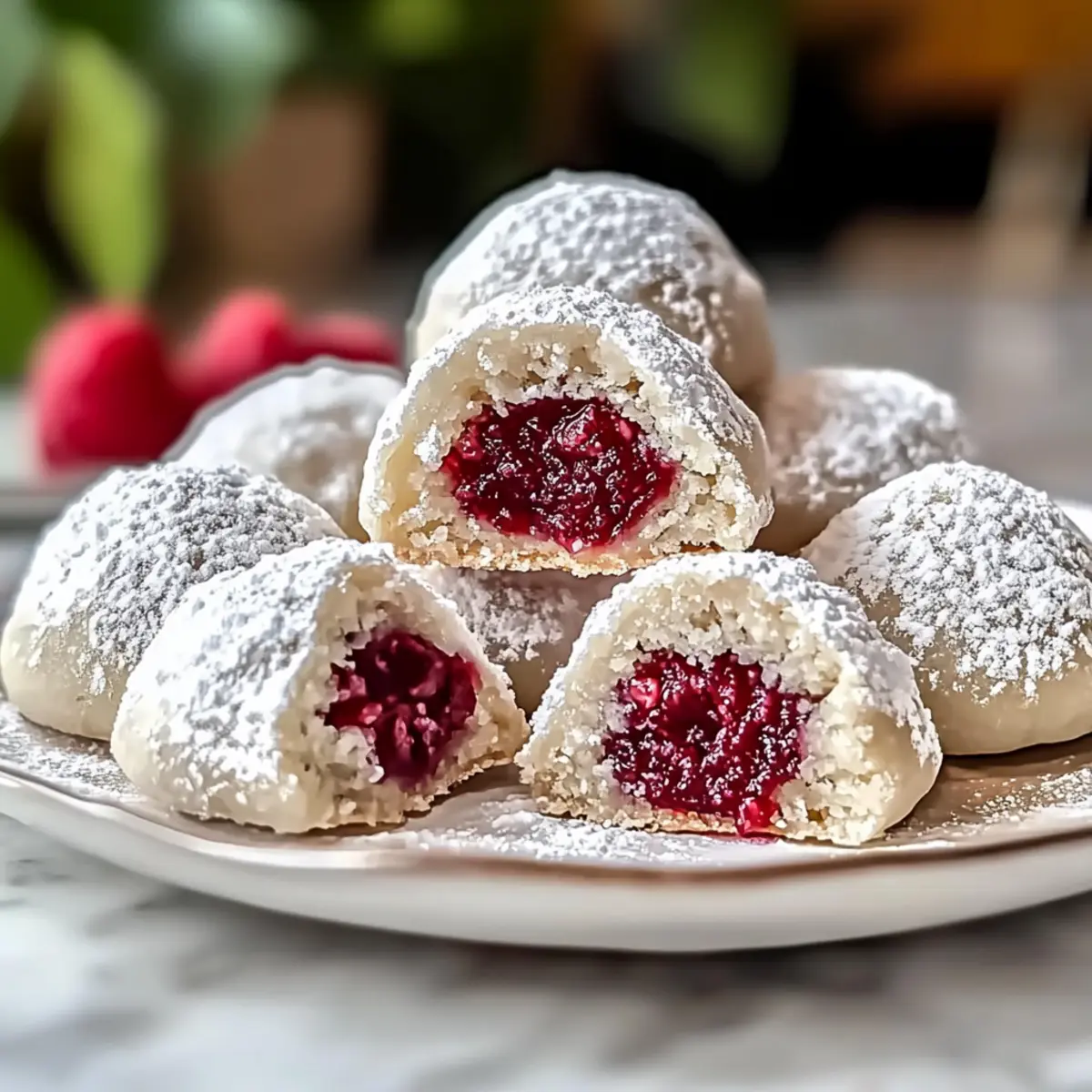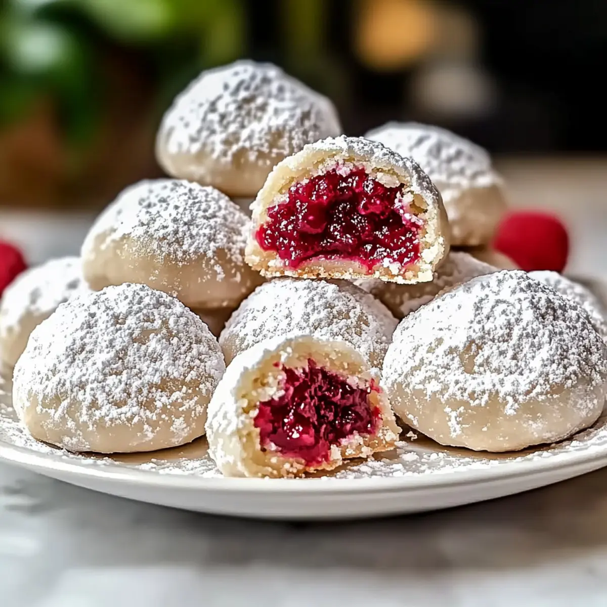• Double Dusting: Roll your cooled cookies in powdered sugar twice for a gorgeous, snowy finish that adds an irresistible sweetness to your Raspberry Almond Snowball Cookies.