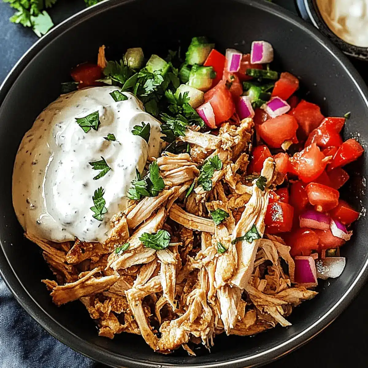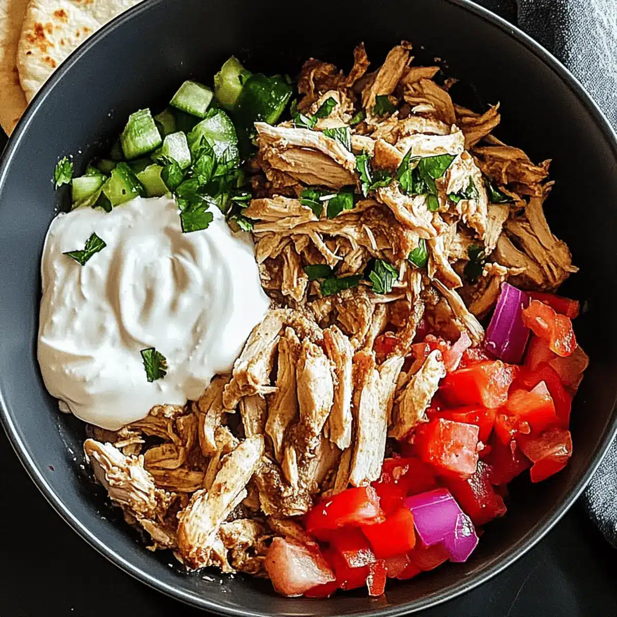 - Serve and Enjoy: Spoon shredded chicken into warm pita, add veggies, and top with yogurt sauce.