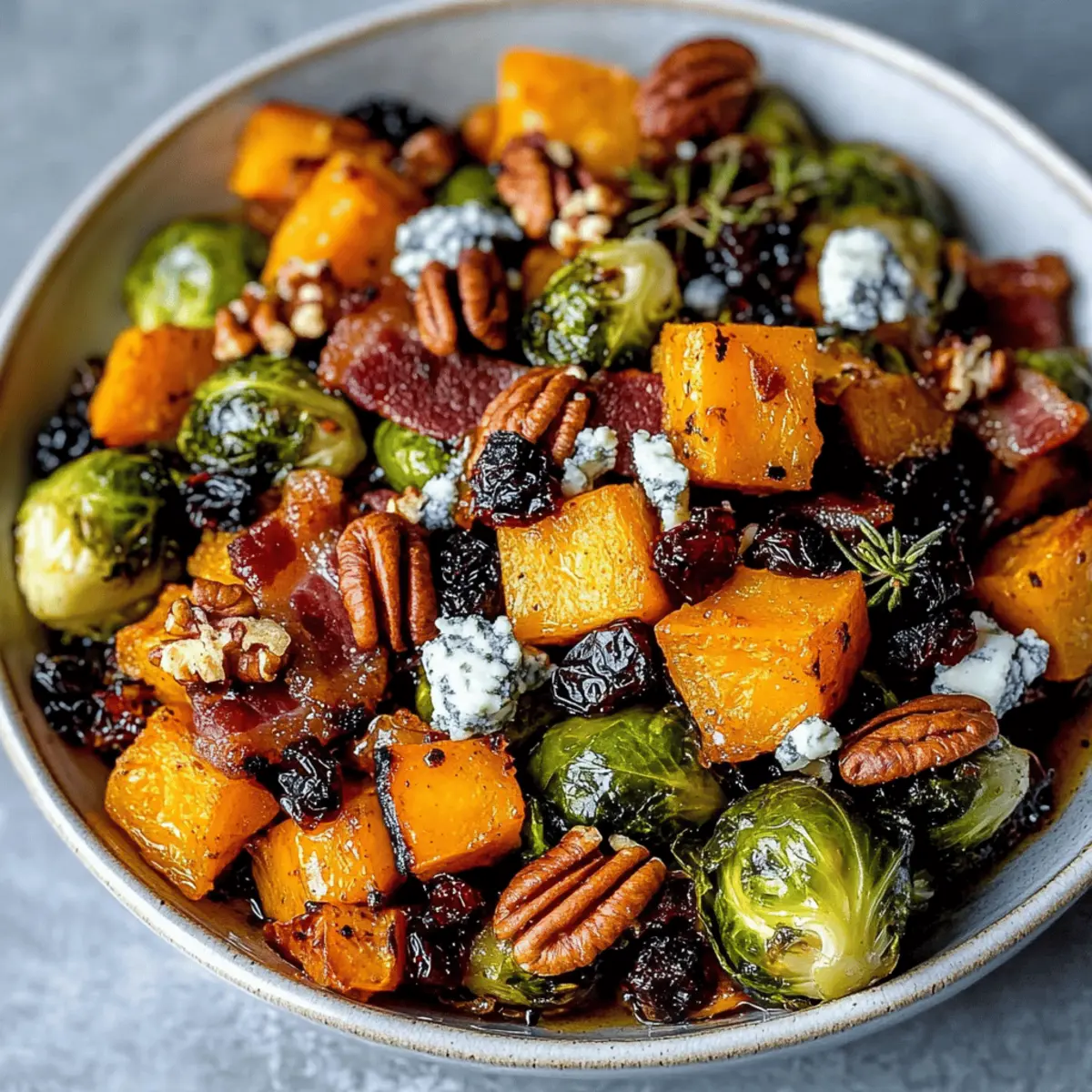 In a large serving bowl, combine the roasted Brussels sprouts and butternut squash with the chopped bacon, dried cranberries, and toasted pecan halves. Gently toss everything together, allowing the ingredients to mingle harmoniously. This step creates a vibrant medley of textures and flavors that define your Spicy Maple Butternut Brussels Bacon.