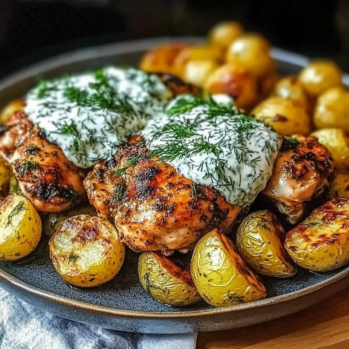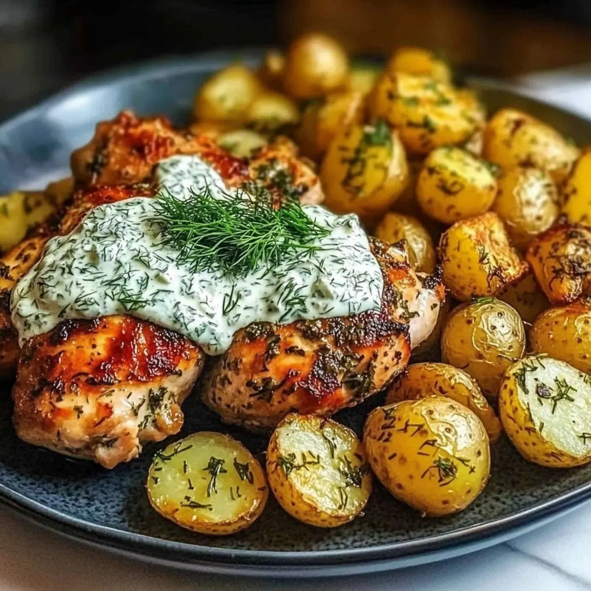 - To serve, plate the sliced chicken next to crispy potatoes. Drizzle with dill feta sauce and garnish with fresh dill. Serve immediately while hot.