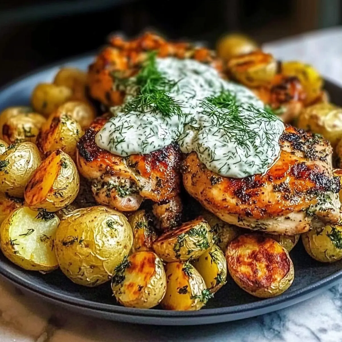 Creamy contrast: Drizzling the dill feta cream adds a luxurious, tangy finish that perfectly complements the savory chicken and crispy potatoes.