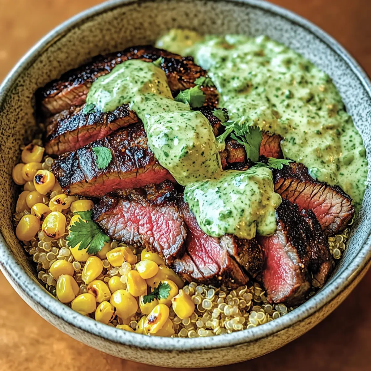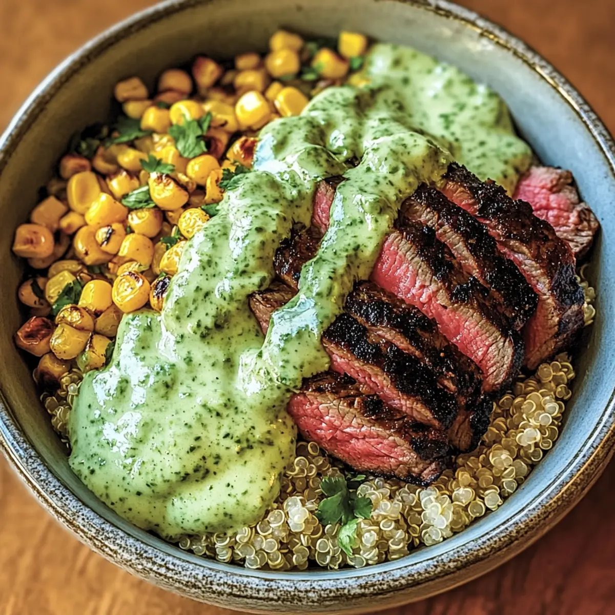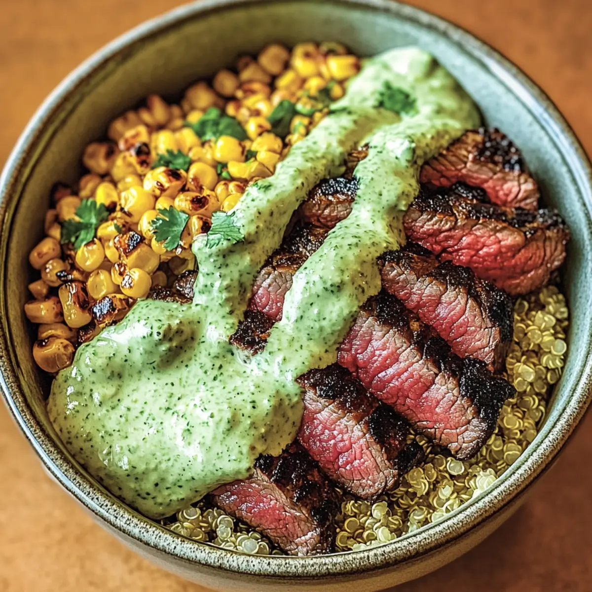 - Assemble the Bowl: Start with quinoa, layer steak, sautéed corn, and avocado, and drizzle with cilantro cream sauce.