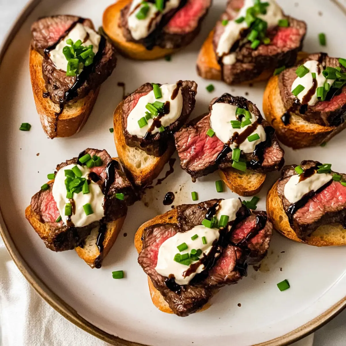 - Assemble crostini by placing a slice of steak on each baguette, drizzle with sauce, and garnish with chives.