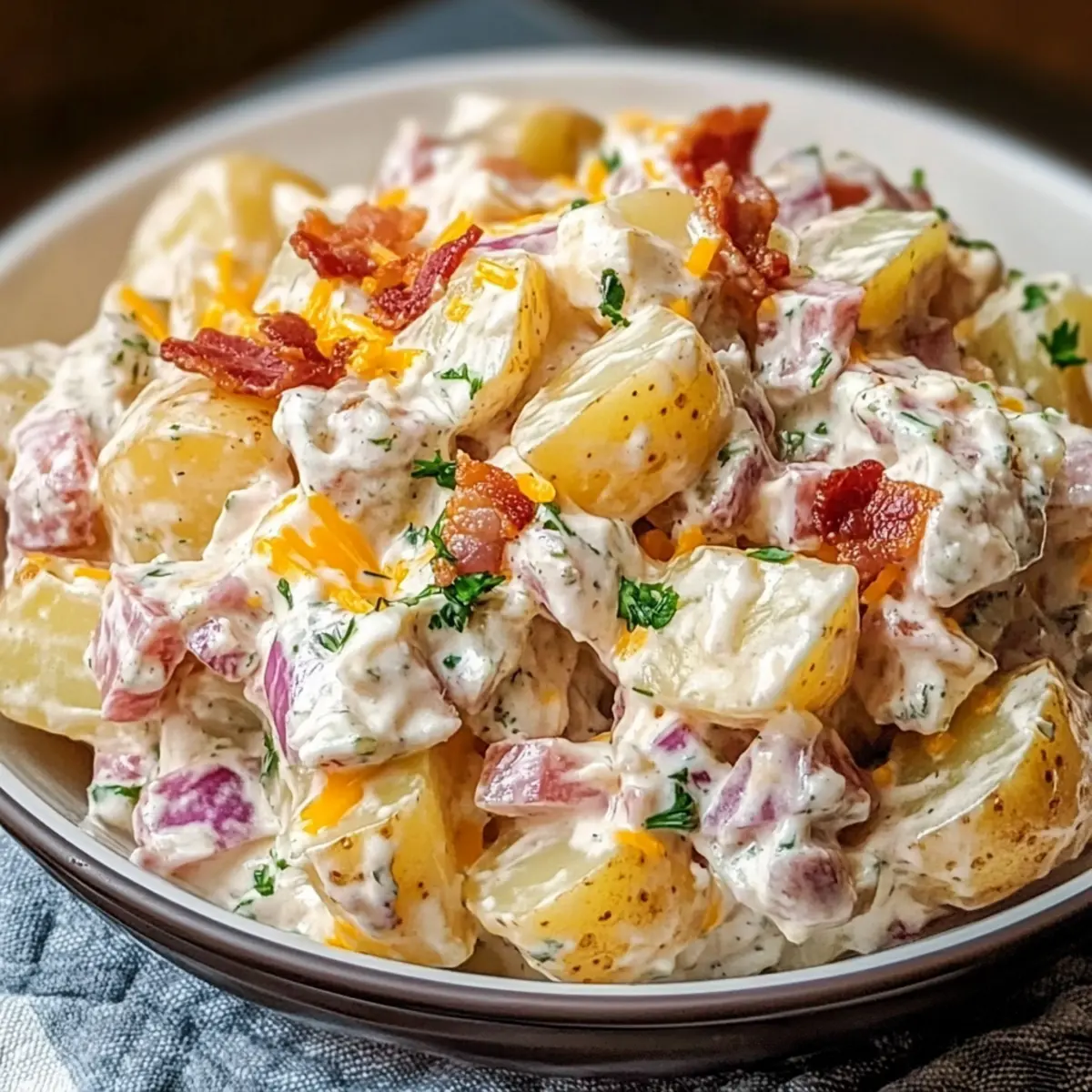 Creamy Comfort: The rich, creamy dressing perfectly blends with tender red potatoes, ensuring each bite is a delight.