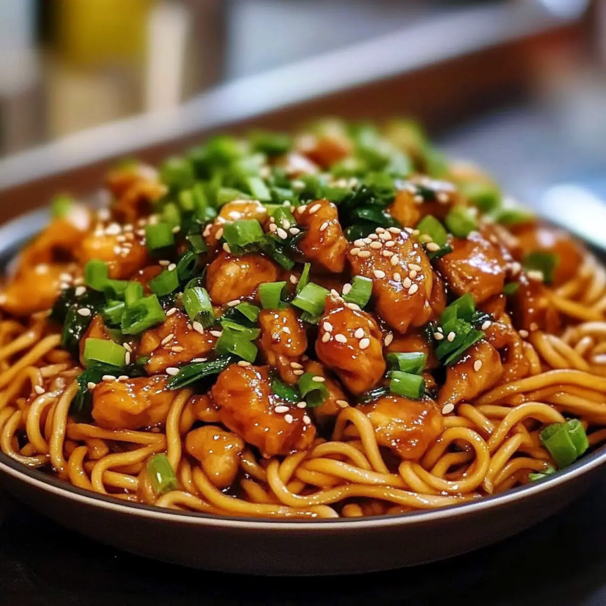 Transfer the Sticky Garlic Chicken Noodles to a serving platter or individual bowls. Finish by garnishing with chopped green onions and optional sesame seeds to add freshness and a slight crunch. Serve immediately, and enjoy the delightful combination of flavors in this quick and easy dinner that’s sure to please!