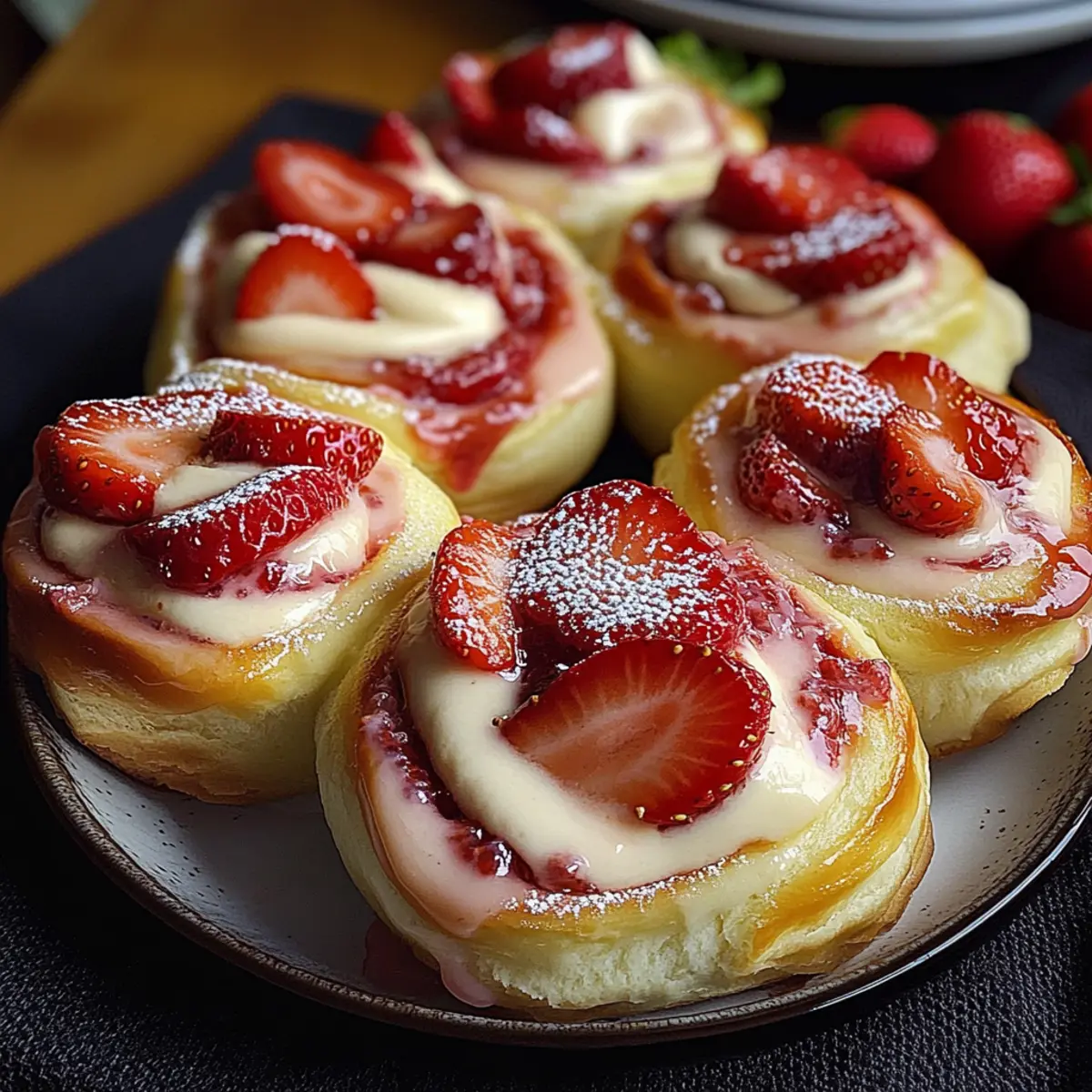 Once baked, remove the rolls from the oven and allow them to cool in the pan for about 10 minutes. Dust the top with powdered sugar for added sweetness and garnish with fresh strawberries. These Strawberry Cheesecake Sweet Rolls are best served warm, ready to delight your family and friends!