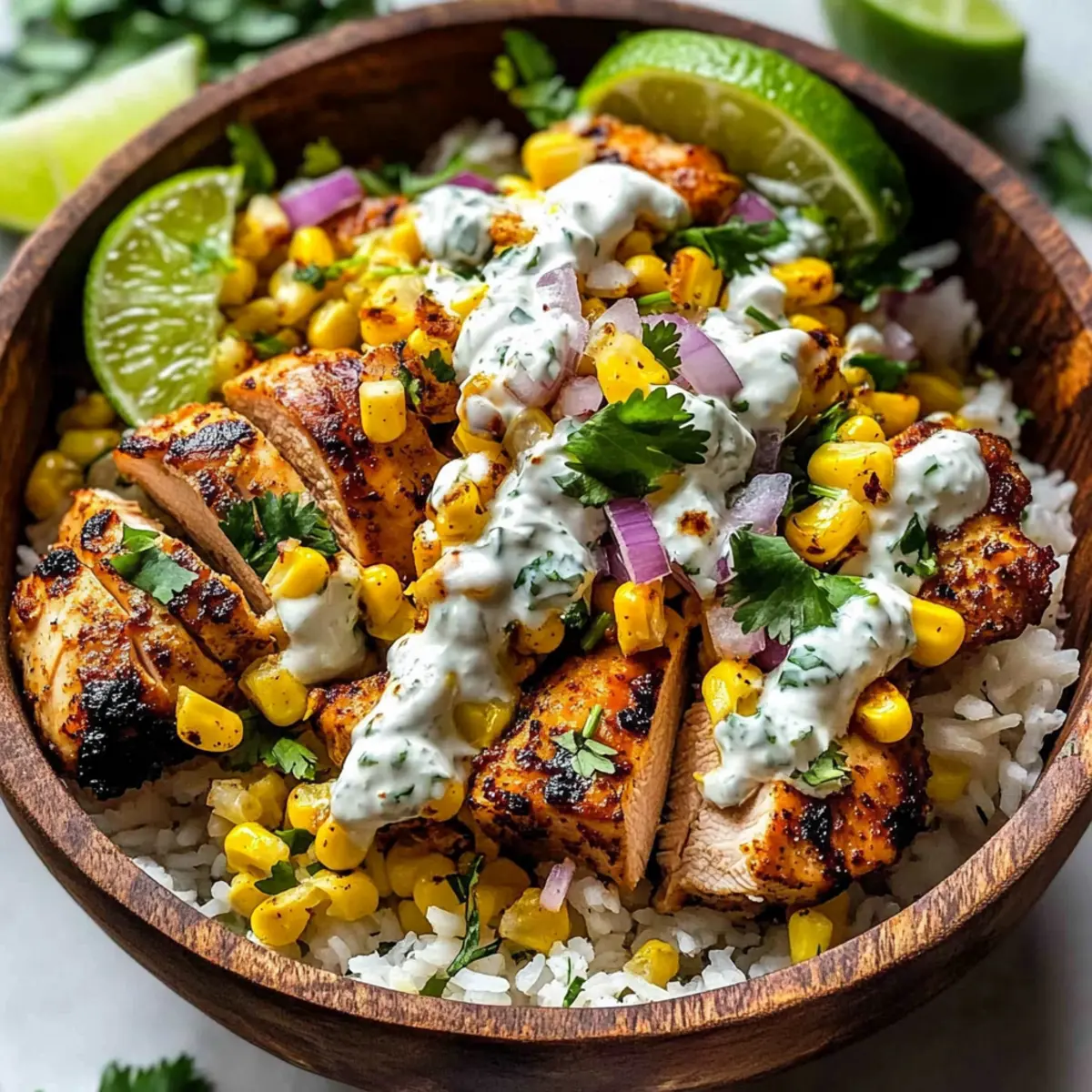 Now it’s time to bring together your delicious Street Corn Chicken Bowl! Start by dividing the fluffy rice among serving bowls. Top each with the sliced, juicy chicken and then generously spoon the creamy street corn mix over everything. Finish with a sprinkle of cotija cheese, fresh cilantro leaves, and lime wedges for a zesty kick that will make this meal unforgettable.