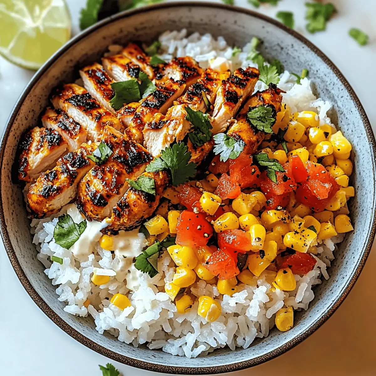 Next, slice your grilled chicken into strips and layer it over the rice. Add equal portions of the sautéed corn, black beans, diced tomatoes, and diced red onion on top, creating a colorful and appetizing display. Each component brings a different texture and flavor, making the Street Corn Chicken Rice Bowl a delightful medley.