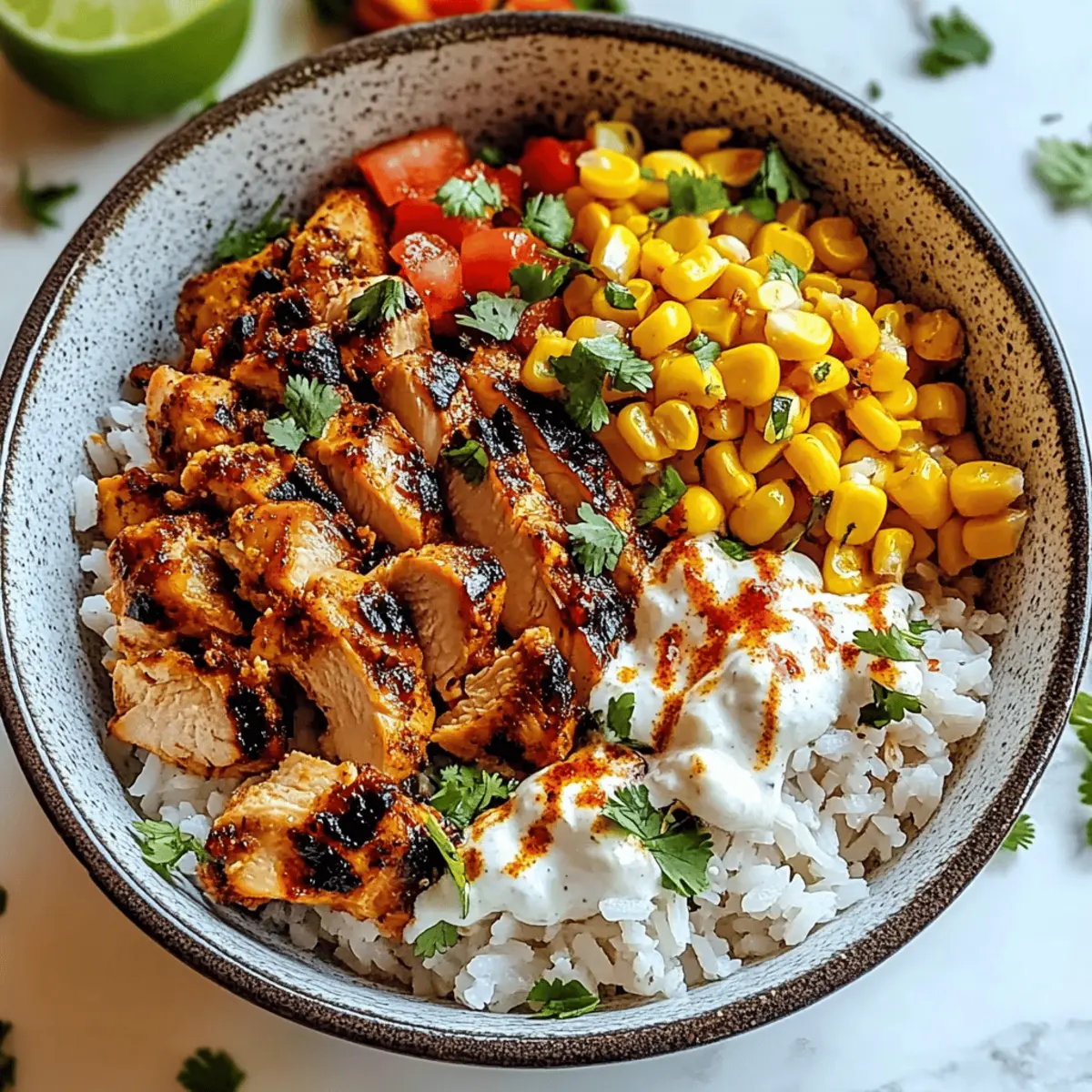 In a small mixing bowl, combine ½ cup of sour cream or Greek yogurt, the juice of one lime, ¼ teaspoon of garlic powder, and a pinch of salt. Whisk the mixture until smooth and creamy, adjusting the lime juice to your taste. This lime crema will add a refreshing brightness to your Street Corn Chicken Rice Bowl.