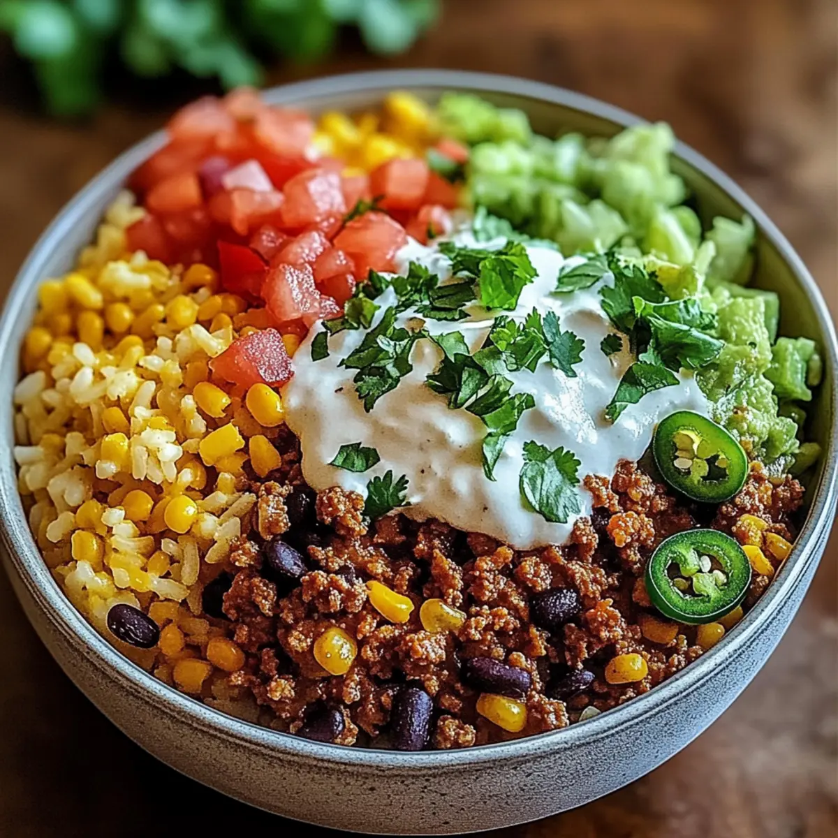 - Assemble the Bowl: Start with a scoop of rice, add meat, then toppings. Finish with cheese, sour cream, and jalapeños.