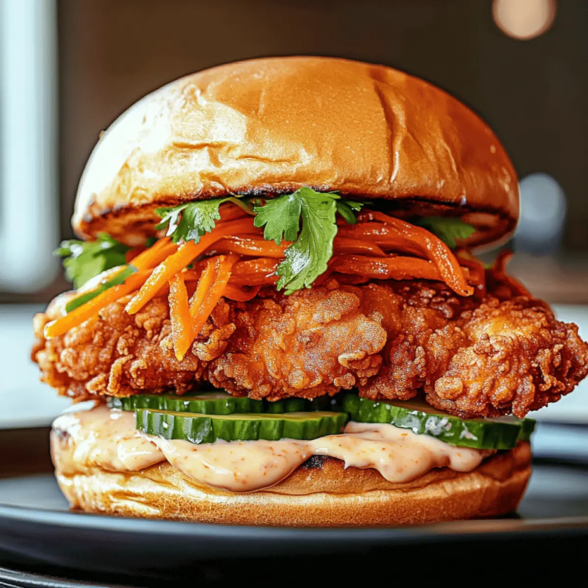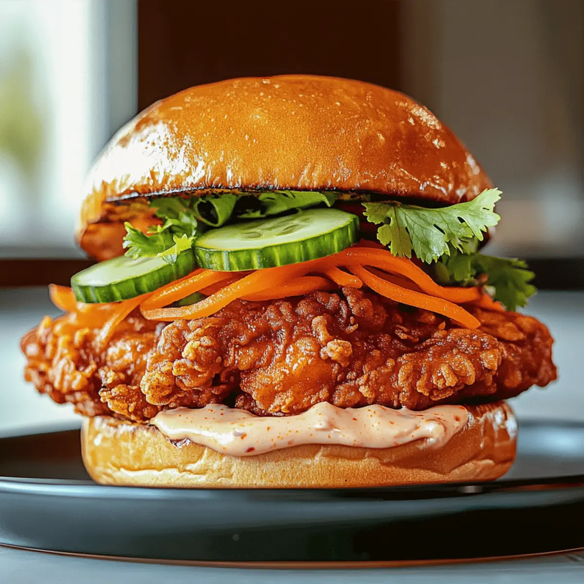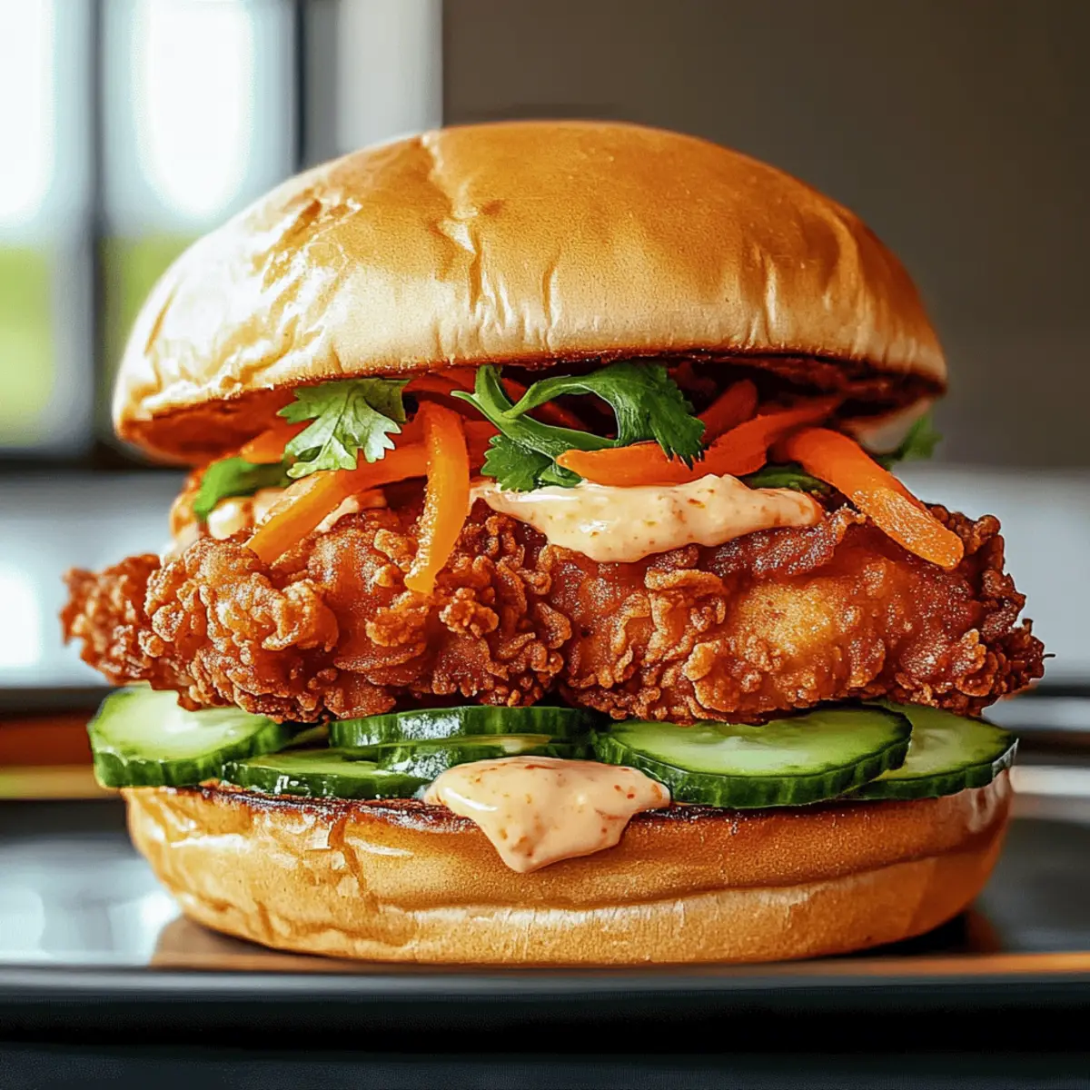 Toast your buns until they are golden brown. Spread a generous amount of the Thai chili mayo on both sides of each bun. Layer the fried chicken on the bottom bun, followed by fresh cucumber slices and pickled carrots. Add a sprinkle of fresh herbs, pressing everything down gently to hold the sandwich together.