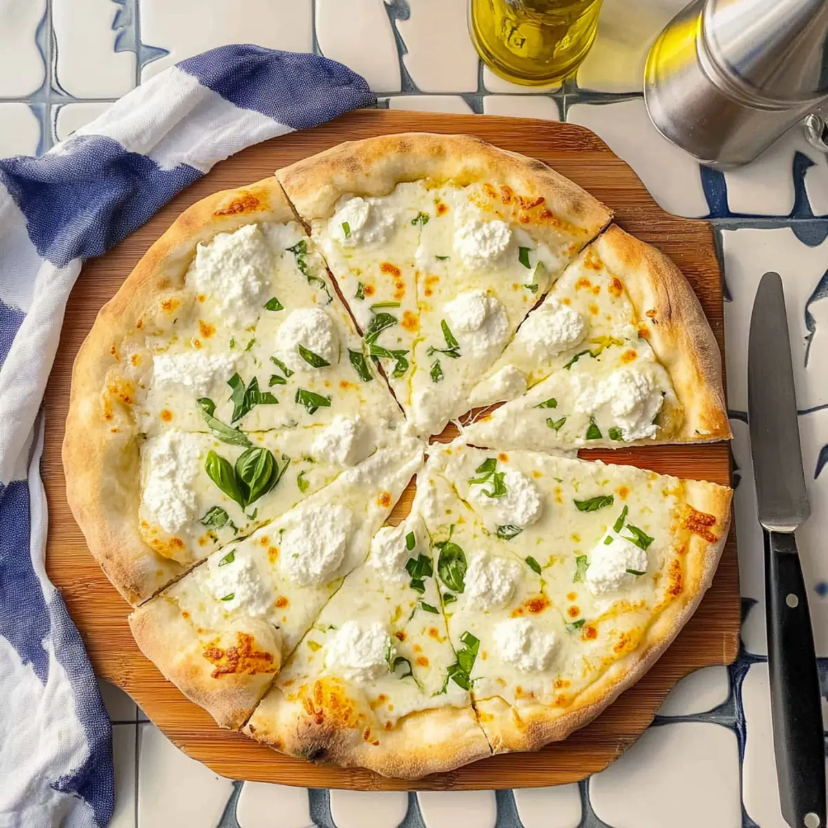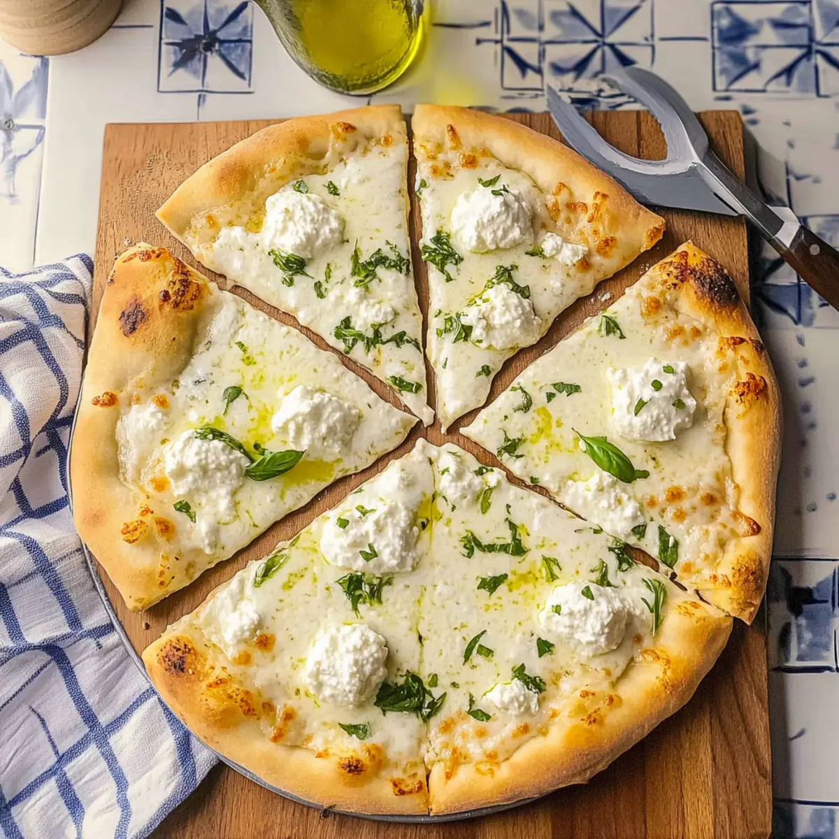 Once baked to perfection, remove the pizza from the oven and drizzle with a little extra olive oil for added richness. Let it cool for about 5 minutes before garnishing with freshly chopped basil or parsley for a pop of color. Now, slice your delicious White Pizza with Ricotta and get ready to enjoy a slice of Italian comfort!